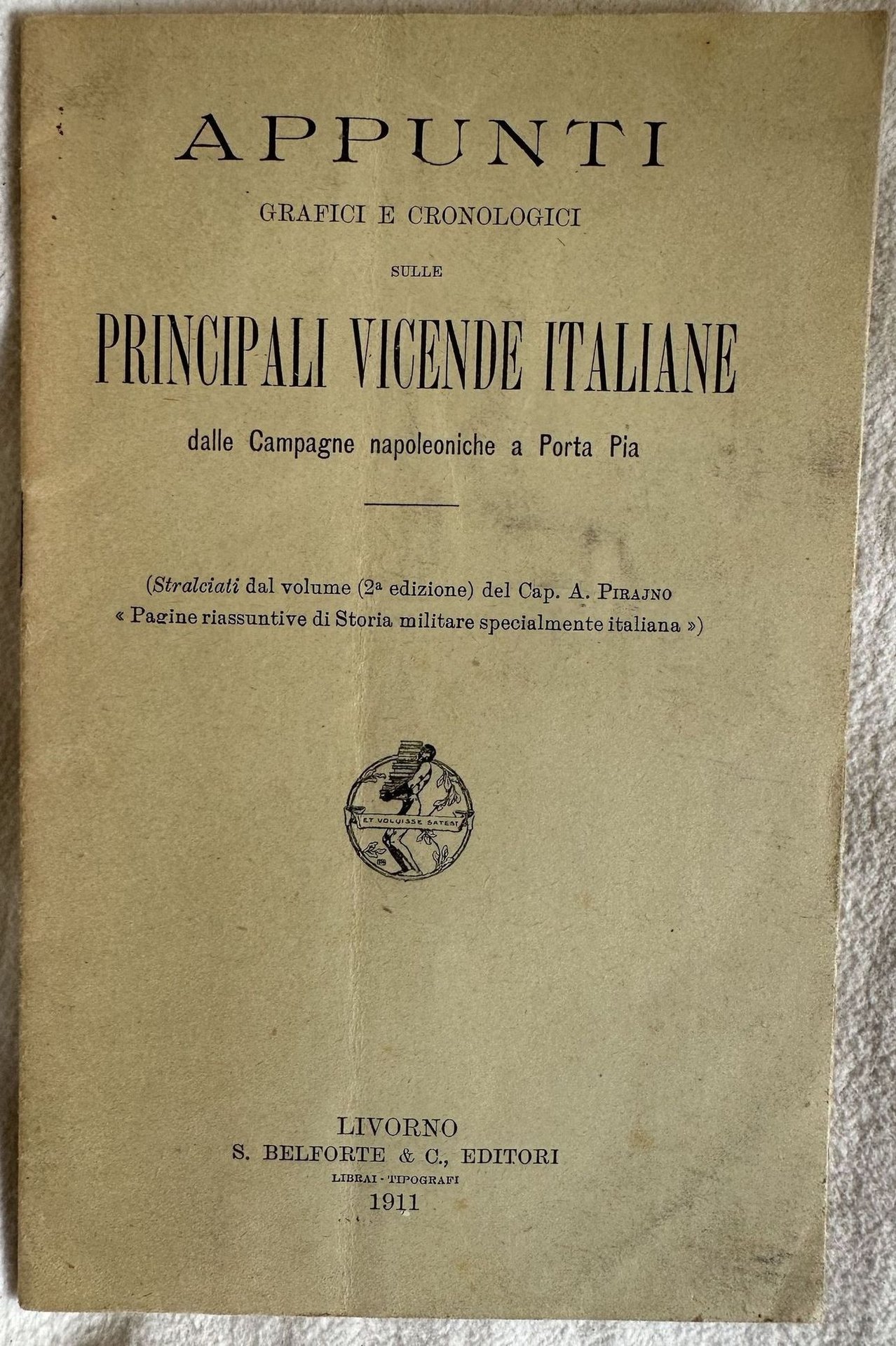 Edizione del 1911 di questa pubblicazione su alcune vicende italiane raccolte in una serie di tabelle (Periodo napoleonico, conseguenze in Italia degli avvenimenti del periodo napoleonico, Periodo delle cospirazioni, Periodo del Risorgimento, Elenco dei più noti comandanti di truppe. Estratto dal volume del Cap. A. Pirajno (Pagine riassuntive di storia militare specialmente italiana".) In buone condizioni. Copertina editoriale in buone condizioni con lievi usure ai margini e dorso. Legatura in buone condizioni. Pagine in buone condizioni con fioriture. Piegatura verticale. In 16. Dim. 18,5x12 cm. Pp. 11+(1).Edition of 1911 of thisn pamphlet abou some italian happenings resumed in charts (Periodo napoleonico, conseguenze in Italia degli avvenimenti del periodo napoleonico, Periodo delle cospirazioni, Periodo del Risorgimento, Elenco dei più noti comandanti di truppe. Extract from the volume del Cap. A. Pirajno (Pagine riassuntive di storia militare specialmente italiana".) In good conditions. Editorial cover in good conditions lightly worn in the extremities. Binding in good condtions. Pages in good conditions with foxing. Vertical folding. In 16. Dim. 18,5x12 cm. Pp. 11+(1).