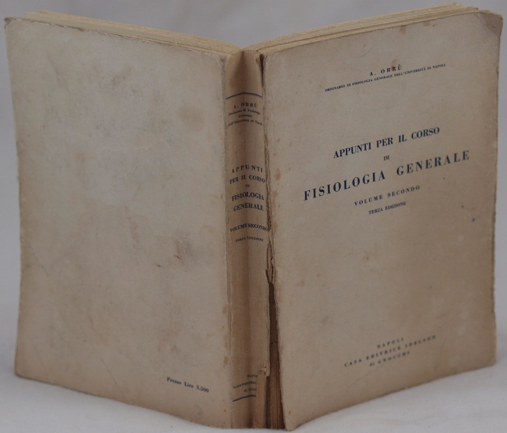 In 8. Dim. 24x17 cm. Pp. 614+(2). Interessante volume, gli appunti per il corso di fisiologia generale scritto da Antonietta Orrù Ordinario di fisiologia dell'Università di Napoli. Gli appunti sono in copia dattiloscritta. L'opera era composta da due volumi, siamo purtroppo in possesso solo del secondo volume. All'interno: Organizzazione della materia vivente, fisiologia generale del sistema muscolare, sistema nervoso, Circolazione del sangue, respirazione, nutrizione, Metabolismo energetico ecc. Alcune sottolineature nel testo. In discrete condizioni. Copertina editoriale in discrete condizioni generali con usure ai margini e dorso. Piatto anteriore in parte staccato. Legatura in discrete condizioni con rotture. All'interno le pagine si presentano in ottime condizioni con rare fioriture. Interesting volume, the notes for the course of general physiology written by Antonietta Orrù Ordinary of physiology in the University of Naples. The notes are in typewritten copy. The work was made up of two volumes, unfortunately we only have the second volume. Inside: Organization of living matters, general physiology of muscle system, nervous system, Circulation of blood, breathing, nutrition, Energetic metabolism ecc. Some underlinings in the text. In fair conditions. Editorial cover in fair general conditions with wearings and missing parts in the edges and spine. Front plate partially detached. Binding in fair conditions with cracks. Inside pages are in very good conditions with occasional foxings.