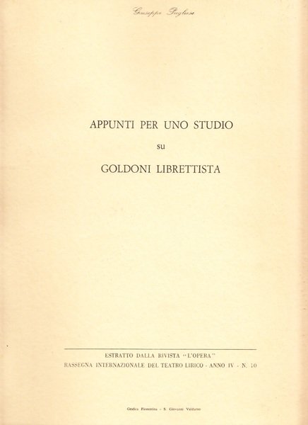 Appunti per uno studio su Goldoni librettista. Estratto dalla rivista L'Opera, rassegna internazionale del teatro lirico, anno IV, n. 10.