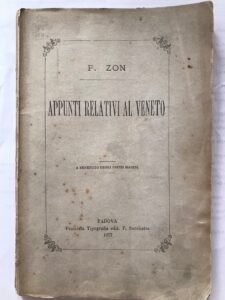 A beneficio degli ospizi marini. L'autore descrive le cause storiche delle divisioni del popolo veneto con particolare riguardo al sistema dei trasporti (navigazione, ferrovia, strade) che sembra tagliar fuori la città di Venezia. Qualche fioritura, normale brunitura della carta, appunti a matita alla sguardia ant. Timbro di precedente proprietrio al frontespizio. Pagg. 96. Brossura edit. Mis mm 190x125