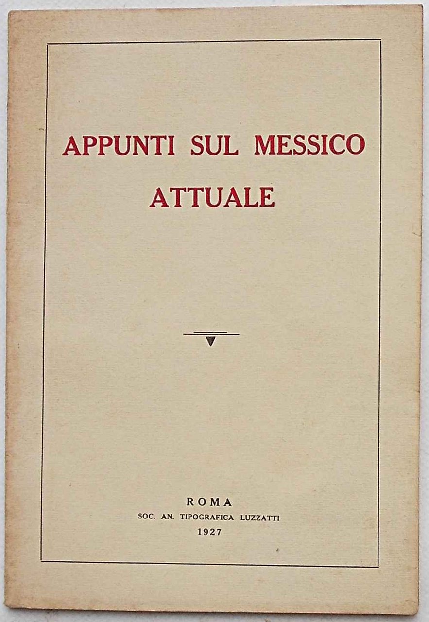 In 8° (cm. 24 x 17); pagg. 53; con 1 tavola f.t.; leggera carton. origin. VG. ** Non ci sono indicazioni dirette, ma si tratta certamente di una pubblicazione governativa di promozione commerciale del Messico all'estero. In apertura si trova una tavola con i ritratti del presidente Gen. Plutarco Elias Calles e dei membri del suo gabinetto. "Dunque il Messico fa un gigantesco sforzo per il suo progresso e non valgono ad arrestarlo le mene diverse che qualche volta voglion farsi sentire."
