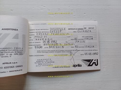 Aprilia Climber Trial 1990 libretto garanzia originale usato