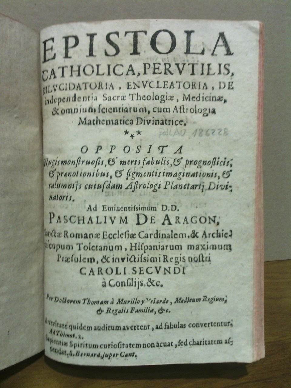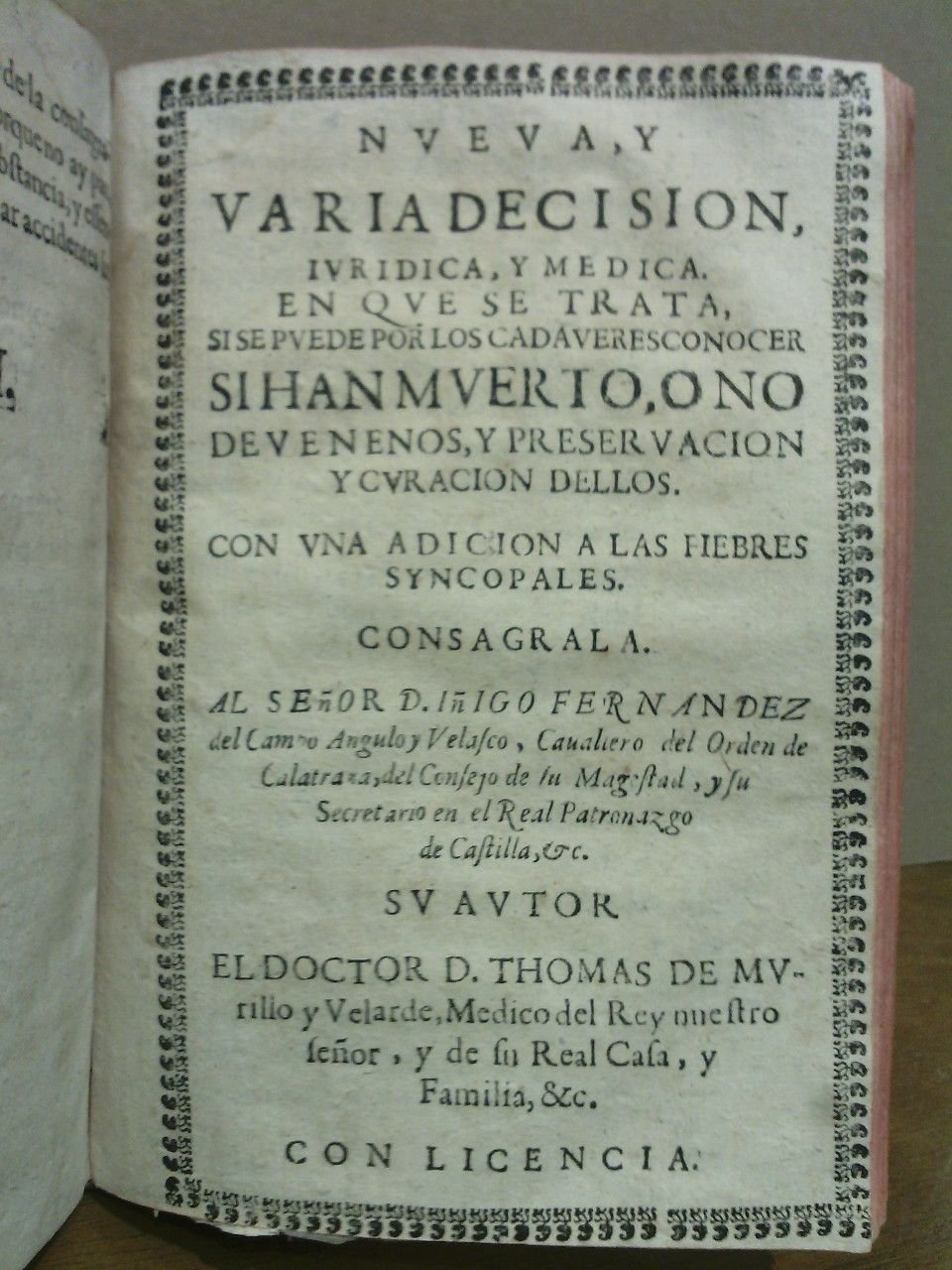 PRIMERA EDICION.- Con licencia en Zaragoça: Diego de Ormer, 1672.- 12 h.], 146 folios, [7 h.]: Escudo grabado. [SIGUE]: MURILLO Y VELARDE, Thomas de.- Nueva, y varia decisión, iurídica y médica. En que se trata, si se puede por los cadáveres conocer si han muerto, o no de venenos, y preservación y curación dellos. Con una adición a las fiebres syncopales. Conságrala al Sr. D. Iñigo Fernandez del Campo Angulo y Velasco.- PRIMERA EDICION.- [Zaragoza o Madrid?]: [s. n., Diego de Ormer?], [1675].- [4 h., debían ser 8 h., pero al parecer no lleva las 4 h. de la presentación que dedica la obra], 55 folios. [SIGUE]: MURILLO Y VELARDE, Thomam.- Epístola catholica, perutilis, dilucidatoria, enucleatoria, de independentia Sacrae Theologiae, Medicinae, & omnium scientiarum, cum Astrologia Mathematica Divinatrice. Opposita. Nugis monstruosis et meris fabulis, et prognosticis, et praenotionibus, et sigmentis imaginationis, et calumnijs cuiusdam Astrologi Planetarij Divinatoris.- PRIMERA EDICION.- [S. l., Madrid?]: [s. n.], [ca. 1674].- 5 folios, [2 h.], 5-44 folios.- LAS TRES OBRAS EN 4º MENOR (20,5 cm) Y ENCUADERNADAS FORMANDO UN SOLO VOLUMEN EN PLENA PIEL DE LA EPOCA. "LA SEGUNDA DE LAS OBRAS RESEÑADAS ES LA MAS RARA DEL AUTOR". EN DEFINITIVA, TRES RARISIMAS OBRAS. PALAU respectivamente Nos. 186224, 186229 y 186228.* La 1ª de las obras tiene 4 hojas manchadas de humedad y restos de un sello tampón en la portada; la 2ª obra, como arriba indicamos, creemos que está falta de 4 h. correspondientes a la dedicatoria del libro, ya que en el Palau se indica que son 8 h.; la 3ª obra tiene el papel algo tostado por la acidez y una mancha de humedad en su ángulo superior interno. La encuadernación algo fatigada, pero restaurada. EN GENERAL BUEN ESTADO. ALTA BIBLIOFILIA: INCREIBLE CONJUNTO DE OBRAS DE MEDICINA FORENSE, TOXICOLOGIA Y PSIQUIATRIA DE LA EPOCA: En la 1ª de las obras citadas, el autor trata de las eficaces virtudes que el chocolate, la quina y otras plantas alimenticias ejercen sobre el corazón, y como son causa de la melancolía. En la 2ª (QUE ES LA MAS RARA DEL AUTOR) da una idea sobre los venenos en la época. En la 3ª, con gran erudición, demuestra que la medicina es una ciencia que no tiene nada que ver con la astrología ni otros conocimientos que se involucraban con la medicina en aquella época. Thomás Murillo y Velarde nació en Belalcázar sobre el año 1610 en la provincia de Córdoba y según Nicolás Antonio, era descendiente de una familia ilustre; estudió medicina en la Universidad de Alcalá de Henares y en la misma obtuvo el título de Doctor, llegando a ser un eminente botánico y medico real de Felipe IV y Carlos II. Se estableció en Bujalance como médico, luego fue a GRANADA en cuya Universidad consiguió la Cátedra de Vísperas, llegando por sus conocimientos a tener gran reputación. Fue nombrado por el Rey para visitar los pueblos de ANDALUCIA afectados por la peste, en los que hizo una labor encomiable. Mas tarde pasó a MADRID para ser Médico titular de la Real Familia. También tuvo mucha fama por haber ejercido la medicina en los presidios de Orán y en las Galeras Reales españolas. MEDICINA EN GENERAL Y OTRAS ESPECIALIDADES MEDICAS