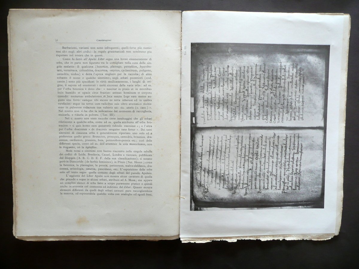 Medicinae Varia in codice dell'VIII secolo conservato nell'Archivio Capitolare della Metropolitana di Modena - Apulei Liber per il Dott. Prof. Riccardo Simonini Direttore della Clinica Pediatrica della R. Università di Modena Incaricato dell'insegnamento della Storia della Medicina Tip. dell'Immacolata Concezione, Modena 1929; cm 33,5x24,5; pp. VI-40, più III tavole in b/n fuori t.; brossura ed. Margine sup. della prima bianca con dedica autografa dell'autore (dicitura omaggio dell'A.", vedi foto). Condizioni di conservazione Esemplare complessivamente in buono stato con tracce d'uso e alcune piccole leggere bruniture, margini e angoli con alcuni minuscoli strappetti e mancanze, qualche lieve traccia di piega / pieghetta, margine sup. della brossura ant. con una nota a pastello rosso (vedi foto); dorso con alcuni strappetti restaurati per mezzo d'incollatura e una mancanza di qualche cm alla parte sup. Margini delle pagine con barbe. Prima e unica trascrizione di tale antico manoscritto pergamenaceo di medicina, databile all'VIII secolo circa e conservato presso l'Archivio Capitolare della Metropolitana di Modena. Margine superiore della prima pagina bianca con dedica autografa dell'autore (dicitura "omaggio dell' A.", vedi foto). SETT140.L13888 N "