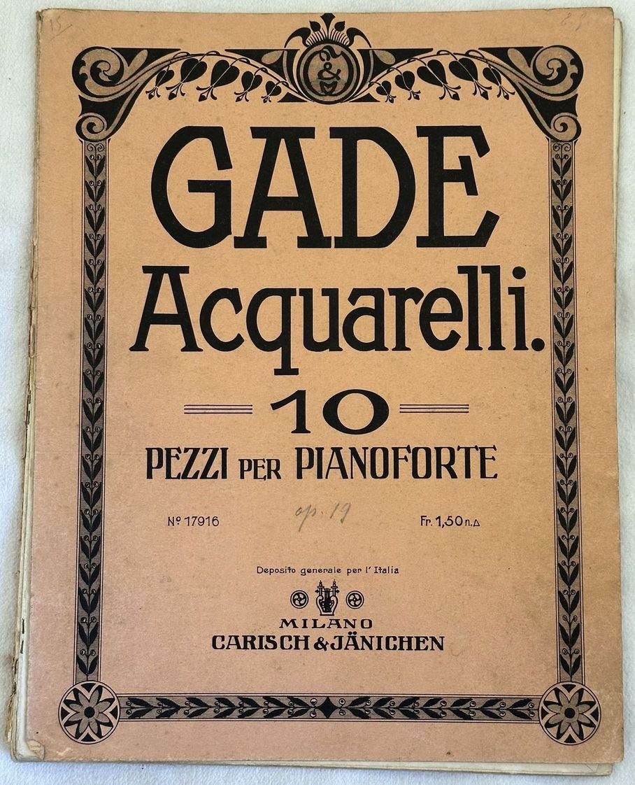 Edizione di fine ottocento di questa raccolta di dieci melodie per pianoforte del compositore danese Niels Gade (1817-1890). Le melodie presenti: Elegie, Scherzo, Canzonette, Humoreske, Barcarole, Capriccio, Romanze, Intermezzo, Novellette, Scherzo. In discrete condizioni. Copertina editoriale in discrete condizioni con lievi usure marginali. Piatti in parte staccati. Legatura in buone condizioni. Pagine in ottime condizioni con rare fioriture. In folio. cm. 30x23,5. Pp. 31.Edition of late of 19th century of ten musical score by the danish composer Niels Gade (1817-1890). The melodies: Elegie, Scherzo, Canzonette, Humoreske, Barcarole, Capriccio, Romanze, Intermezzo, Novellette, Scherzo. In fair conditions. Editorial cover in fair conditions with lightly worn in the extremities. Plates partially detached. Binding in good conditions. Pages in very good conditions with occasional foxing.In folio. cm. 30x23,5. Pp. 31.<BR><BR>