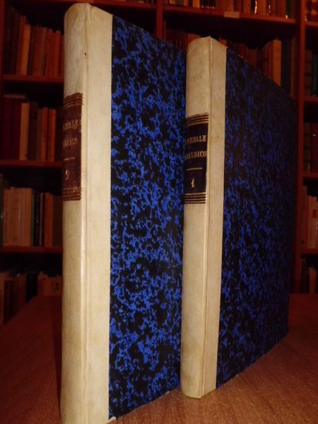 (Araldica) GIORNALE araldico-genealogico-diplomatico italiano compilato da una società di araldisti e genealogisti e diretto da G.B. Crollalanza. Anno 1873-1874. Tomo primo. Anno 1874-1875 - Tomo secondo. Fermo - Pisa 1874 - 75. 2 volumi in-8° grande, m. pergamena. (2), 388, (2) pp.; (2), 420, (2) pp. Numerose illustrazioni di stemmi e alberi genealogici n.t. Spreti-Degli Azzi, 1788: << Questo periodico fondato dal principe degli araldisti italiani, Giambattista di Crollalanza.è un vero tesoro nobiliare d' Italia.>>. Uff. Mob. 2