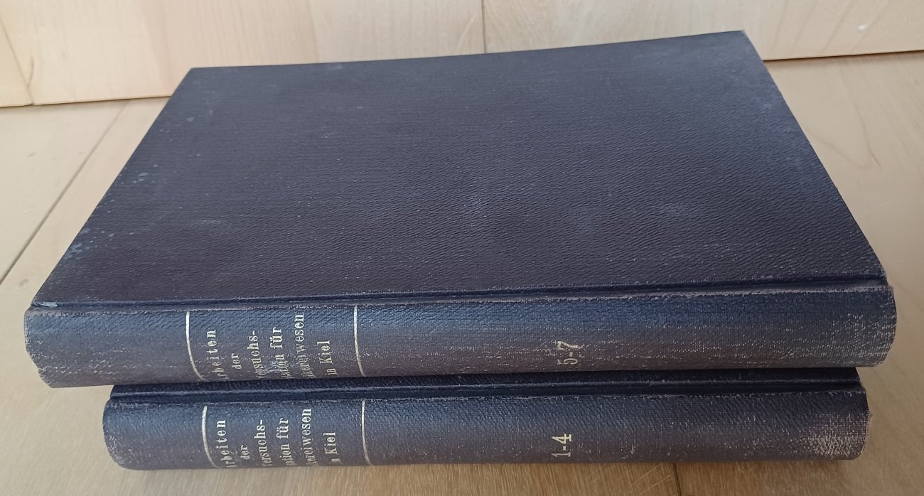 Der Herausgeber der Reihe war Hermann Weigmann (17.1.1856, Fürth bis 19.2.1950, Kappeln/Schlei), Bakteriologe und Milchwissenschaftler, ab 1889 der Vorsteher des Instituts „Versuchsstation und Lehranstalt für Molkereiwesen“ in Kiel und gilt als Begründer der modernen Milch-Bakteriologie in Deutschland; (mehr siehe FürthWiki). - Die Hefte enthalten zahlreiche Textillustrationen und Illustrationen in Kunstdruck und Lithographie auf Tafeln. - Beiträge: 1. Heft. Über den Einfluß der Fütterung auf die Menge der flüchtigen Fettsäure in der Butter, von Weigmann + O. Henzold; Versuche über die Filtration der Milch durch Sand, vorgenommen an Kröhnke's Sandfilter, von Weigmann + R. Eichloff; und andere Beiträge. - 2. Heft: Versuche über die Pasteurisierung der Milch, von Weigmann. - 3. Heft: 10 Beiträge, meist über verschiedene Bakterien, z.B. das Bakterium der "seifigen Milch" (Bacterium sapolactium) von W. Eichholz, einen die Milch rosa färbenden Bazillus, Bacillus lactorubefaciens, von Th. Gruber, eine Erdbeergeruch erzeugende Bakterie, Pseudomonas Fragariae, und andere Beiträge. - 4. Heft: 14 Beiträge zu verschiedenen technischen Bestimmungs-Geräten, zur Fettbestimmung in Käse, in pasteurisierter Milch und andere Beiträge von Höft, Lauterwald, Burr, Gruber, Lindemann, Weigmann, Ratzlaff. - 5. Heft: 19 Beiträge von Weigmann, Höft (3), Stritter, Burr (9), Gruber (4). Einige Beiträge zu Untersuchungen zum Fettgehalt der Milch, Rahm, über Gärungserreger, etc., von Weigmann + Gruber + Huss "Einige bakteriologische Untersuchungen aus der milchwirtschaftlichen Praxis". - 6. Heft: 9 Beiträge. Über das Verhältnis der stickstoffhaltigen Bestandteile in Milch und Rahm von Höft, Beiträge zur chemischen Unterscheidung des Labgerinnsels vom Sauermilchgerinnsel von Höft, Versuche über die Labwirkung von Höft. Untersuchungen über Milchserum von Burr + Berberich + Lauterwald. Über den Säuregrad des Rahms und der zugehörigen Buttermilch von Burr + Berberich. Über Fettbestimmung im Rahm mit dem Refraktometer von Wollny von Burr + Berberich. Beiträge zur Titration von Milchflüssigkeiten von Burr + Berberich. Kolostrumuntersuchungen von Burr + Berberich. Untersuchungen käuflicher Labpräparate von Burr + Berberich. - 7. Heft: 8 Beiträge. Darunter "Über armenisches Mazun" von Weigmann + Gruber + Huss. Weitere Beiträge von Huss (5), Fettick, Wolff. - ACHTUNG! Dieses Buch kann wegen seines Gewichts oder seiner Größe nur als PAKET verschickt werden. Innerhalb Deutschlands 5,80 Euro. (Portokosten ins Ausland bitte erfragen.) / ATTENTION! Due to its weight or size this book can only be sent as a PARCEL. Within Germany 5,80 Euro (For shipment abroad please ask).