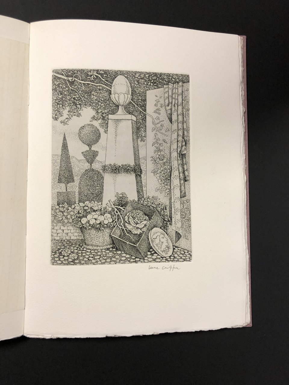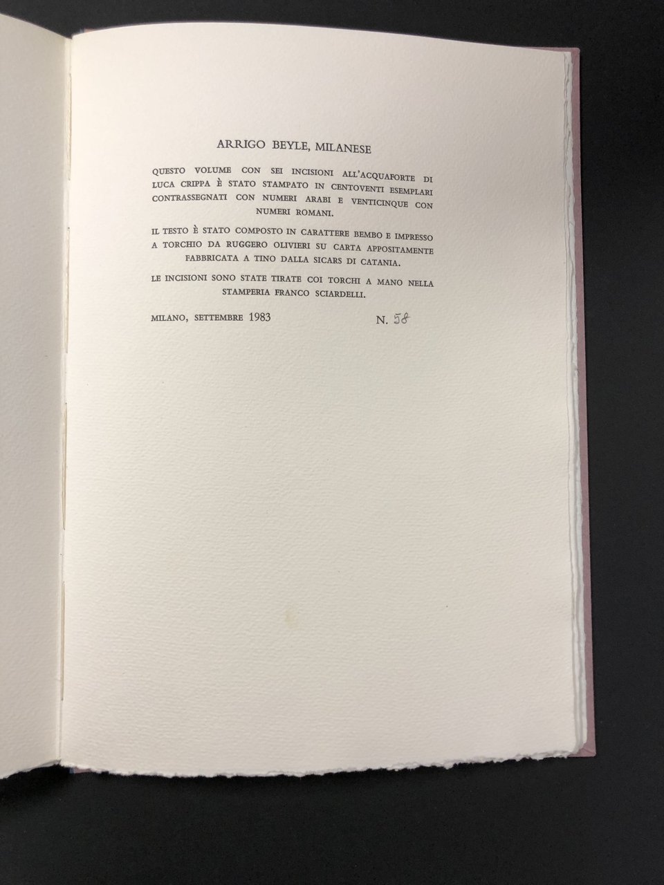 Legatura editoriale in mz. Pelle con titoli in oro al dorso, piatti cartonati stampato quello frontale, in barbe, taglio in testa dorato, cofanetto rigido. Con con 6 incisioni all'acquaforte nel t. (di cui 3 a piena pagina nel testo) firmate da Luca Crippa (1924-2002). Edizione di145 esempl. numerati, con testo composto in carattere Bembo e impresso a torchio da Ruggero Olivieri su carta appositamente fabbricata a tino dalla Sicars di Catania. Le incisioni sono state tirate coi torchi a mano nella stamperia Franco Sciardelli. La ns. copia n. 58, appartiene alla tiratura di 120 esempl. contrassegnati con numeri arabi.
