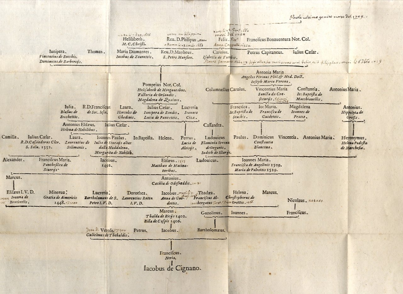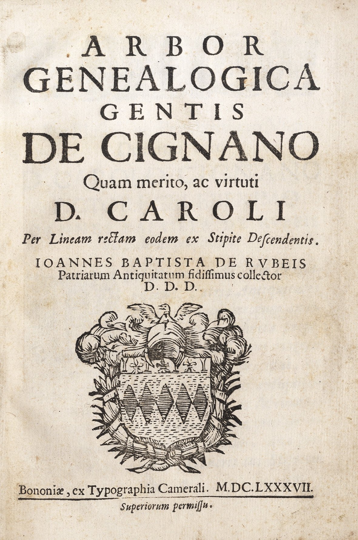 Arbor Genealogica Gentis de Cignano, Quam merito, ac virtuti D. Caroli. Per lineam rectam eodem ex stipite descendentis. Ioannes Baptista De Rubeis patriarum antiquitatum fidissimus collector D.D.D.