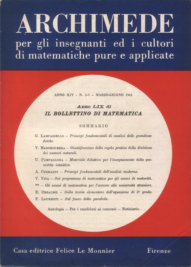 In-8°, pp. da 49 a 160, (16) pubblicitarie, copertina editoriale. A pagina 90, segnetto a penna nel margine sinistro; alle pagine 95 e 132, una correzione a penna; a pagina 140, lettere "y" e "z" scritte a penna. Alcune pagine leggermente arrossate, per il resto in buono stato. Numero doppio. Sommario: Giovanni Lampariello, Principî fondamentali di analisi delle grandezze fisiche; Vincenzo Marseguerra, Giustificazione della regola pratica della divisione dei numeri naturali; Ugo Pampallona, Materiale didattico per l'insegnamento della geometria intuitiva; Armando Chiellini, Principi fondamentali dell'analisi moderna (con queste pagine viene completato l'articolo, del quale fu pubblicata la prima parte nel fascicolo n. 6, anno 1961, e la seconda parte nel fascicolo n. 1, anno 1962); Vincenzo Vita, Sul programma di matematica per gli esami di maturità; Gli esami di matematica per l'accesso alle università straniere (Francia, Gran Bretagna e Irlanda del Nord, Spagna); Antologia. Guido Castelnuovo, La scuola nei suoi rapporti con la vita e con la scienza moderna; Gulliver nel paese senza uno, due e tre; Per i candidati ai concorsi. Temi assegnati agli esami di abilitazione in matematica e in fisica. Esami di abilitazione in matematica e fisica - Classe III - 28 marzo 1962; Esami di abilitazione nelle materie scientifiche - Classe XIV - 20 Marzo 1962; Risoluzione del tema assegnato nel concorso a cattedre di istituti tecnici industriali e commerciali (Classe A VI - 14 dicembre 1960); Egidio Orzalesi, Sulla teoria elementare dell'equazione di 2° grado; Fernando Laurenti, Sul fuoco della parabola; Sezione storico-bibliografica; Notiziario.