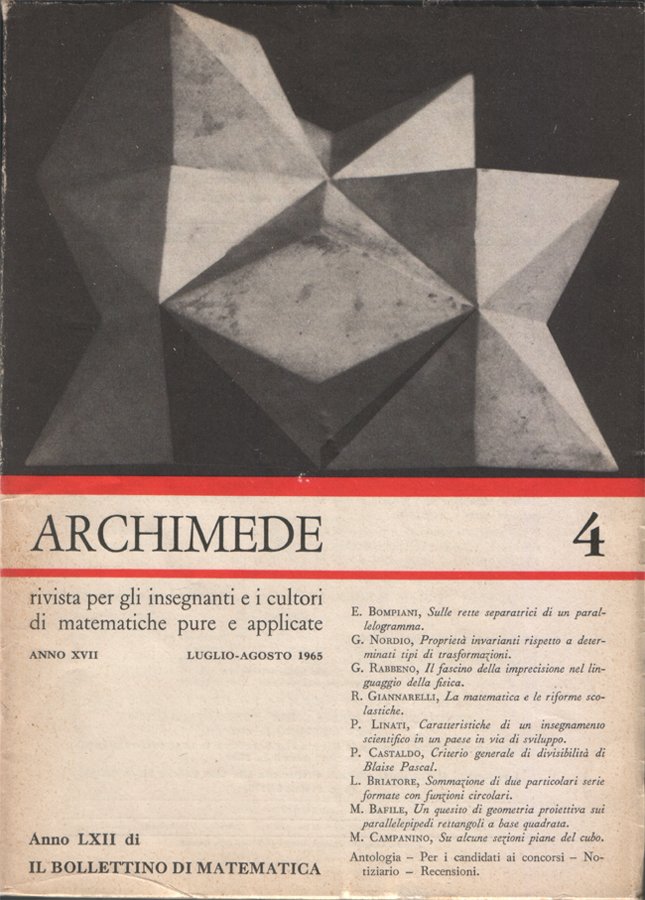 Archimede. Rivista per gli insegnanti e i cultori di matematiche pure e applicate. Anno XVII - N. 4 - Luglio-Agosto 1965. Anno LXII di Il Bollettino di matematica