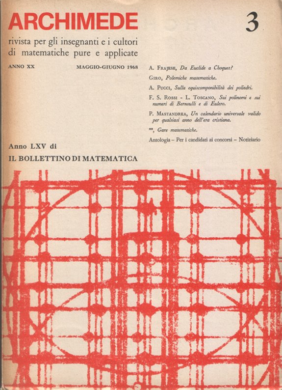 In-8°, pp. da 113 a 168, (4) pubblicitarie, copertina editoriale con normali tracce del tempo (vedi foto). Normale patina del tempo alle pagine, con leggere ingialliture dovute al tipo di carta. Al foglio che ospita le pagine 145-146, nel margine superiore, strappetto, senza perdite, molto ben riparato da piccolo intervento di restauro. A pagina 149, una correzione a penna. Per il resto, in buono stato. Sommario: Attilio Frajese, Da Euclide a Choquet?; Giro, Polemiche matematiche (I "problemi della scuola" dopo le elezioni; Maggiore chiarezza nelle idee, negli scritti, negli ordinamenti); Alfredo Pucci, Sulla equiscomponibilità dei poliedri; Antologia. Unicità fella fattorizzazione in numeri primi; Per i candidati ai concorsi. Risoluzione del tema assegnato al concorso a cattedre nei licei e negli istituti magistrali (Classe IX - 13 aprile 1967); Francesco S. Rossi - Letterio Toscano, Sui polinomi e sui numeri di Bernoulli e di Eulero; Pasquale Mastandrea, Un calendario universale concentrato in sette quadri, valido per qualsiasi anno dell'era cristiana; Gare matematiche. Temi proposti a Torino nella prima prova (20 aprile 1968); Temi proposti a Torino nella seconda prova (4 maggio 1968); Notiziario.