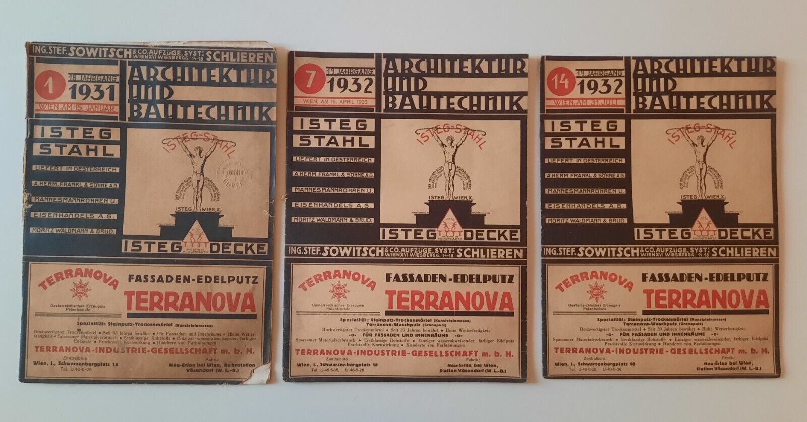 ARCHITEKTURE UND BAUTECHMIK N. 1 DEL 1931 N. 7 - 14 DEL 1932In 4°, legatura editoriale con graffetta, copertina illustrata, ill. in b/n.Segni del tempo al n.1, in ottime condizioni gli altri 2 numeri.