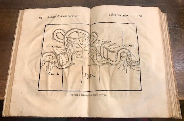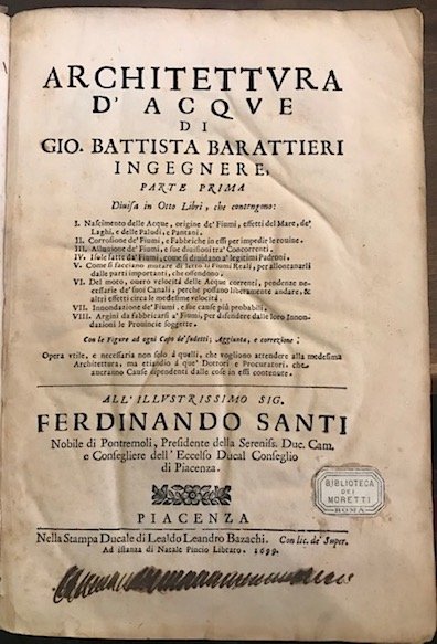 Folio (cm. 30,7), 2 Parti in un volume, ognuna con proprio frontespizio; 8 cc.nn., 276 pp., 2 cc.nn., 304 pp. Con num.se illustrazioni xilografiche n.t. e due tavole f.t. (una a doppia pagina a p. 96 della prima parte ed una ripiegata a p. 258 della seconda parte). Legatura in cartoncino decorato settecentesco. Firma d’appartenenza anticamente cassata al piede del frontespizio. Alone al margine bianco inferiore di circa trenta carte ed arrossature sparse. Nel complesso, esemplare a pieni margini in buono stato di conservazione. Provenienza: collezione Moretti, Roma (ex libris cartaceo applicato al frontis.). Prima edizione che riunisce le due parti di una delle più importanti e pregiate opere antiche di idraulica pratica (relativa in particolare al corso dei fiumi Adda e Po), nonché capolavoro dell'ingegnere lodigiano Barattieri. L'edizione originale è del 1656 seguita, nel 1663, dalla seconda parte. Riccardi (I, 74): ‘Quest’opera del Barattieri è una delle più apprezzate nella idraulica pratica’.