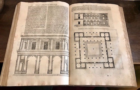 Folio (cm. 38), 2 cc.nn., 433(1) pp. Interamente illustrato da xilografie, tranne il ‘Libro estraordinario’, (cioè il sesto) che presenta figure calcografiche. Eccetto il secondo, ciascun Libro inizia con proprio frontespizio. Ritratto dell’Autore al verso del frontespizio d’insieme e in fine dei Libri secondo e terzo. Al recto dell’ultima carta la raffigurazione del ‘Quadrato geometrico’ di Silvio Belli. Marca tipografica sul frontespizio d’insieme ed in fine. Legatura coeva in pergamena rigida con nervi e titolo ms. al ds. Una piccola macchia d’inchiostro sulla seconda carta e minime arrossature sparse, peraltro esemplare in ottimo stato di conservazione. Rara edizione in italiano e latino curata da Sallustio Piobbici, il cui nome figura nella prefazione. I sei Libri sono così suddivisi: ‘Geometria - Perspettiva - Antiquità di Roma e le altre che sono in Italia e fuori d'Italia - Regole generali di architettura sopra le cinque maniere degli edifici, cioè Thoscano, Dorico, Ionico, Corinthio, e Composito - Diverse forme di Tempij Sacri secondo il costume christiano e al modo antico - Libro Estraordinario: diverse Porte in ordine rustico, & gentile di diversi generi’. Provenienza: collezione Moretti, Roma (timbretto ex libris sulla seconda carta). Fowler (n. 332): ‘The woodcut illustrations of Book I-V seem to be from the same blocks as those of the Venice edition of 1560, but greatly reworked. Book VI contains copper engravings, but only 11 of the usual 50 are found here. An interesting feature of this edition is the numerous printer’s devices and other ornaments used as tailpieces’. Riccardi I, 441 (cita un’edizione pubblicata da Hertz nello stesso anno del tutto simile alla presente).