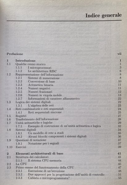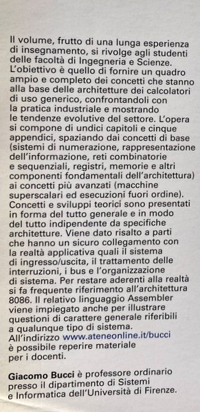 Il testo, frutto di una lunga esperienza di insegnamento, si rivolge agli studenti delle facoltà di Ingegneria e Scienze. L'obiettivo è quello di fornire un quadro ampio e completo dei concetti che stanno alla base delle architetture dei calcolatori di uso generico, confrontandoli con la pratica industriale e mostrando le tendenze evolutive del settore. L'opera si compone di undici capitoli e cinque appendici, spaziando dai concetti di base (sistemi di numerazione, rappresentazione dell'informazione, reti combinatorie e sequenziali, registri, memorie e altri componenti fondamentali dell'architettura) ai concetti più avanzati (macchine superscalari ed esecuzioni fuori ordine). Concetti e sviluppi teorici sono presentati in forma del tutto generale e in modo del tutto indipendente da specifiche architetture. Viene dato risalto a parti che hanno un sicuro collegamento con la realtà applicativa quali il sistema di ingresso/uscita, il trattamento delle interruzioni, i bus e l'organizzazione di sistema. Per restare aderenti alla realtà si fa frequente riferimento all'architettura 8086. Il relativo linguaggio Assembler viene impiegato anche per illustrare questioni di carattere generale riferibili a qualunque tipo di sistema.