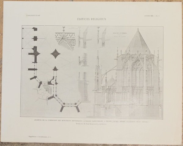 ARCHIVES DE LA COMMISSION DES MONUMENTS HISTORIQUES EGLISE SAINT URBAIN A TROYES (AUBE) ABSIDE.ELEVATION.PLAN.DETAILS Dessin de M. Paul Selmersheim architecte