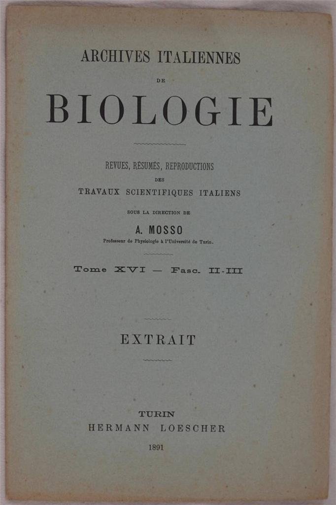 In 8. Dim. 23,5x15,5 cm. Pp. 15. Interessante pubblicazione del 1891, estratto dagli "Archives italiennes de biologie" diretti da Mosso, tomo XVI Fascicolo II, III. L'estratto contiene la pubblicazione "De la pretendue reviviscence des Rotiferes" Sulla pretesa reviviscenza dei rotiferi di Faggioli. In ottime condizioni. Copertina editoriale in ottime condizioni generali con lievi usure ai margini e dorso. Legatura in ottime condizioni. All'interno le pagine si presentano in ottime condizioni con rare fioriture.Interesting pamphlet of 1891, extract from the "Archives italiennes de biologie" directd by Mosso, tome XVI Pamphlet II, III. The extract contains the pamphlet "De la pretendue reviviscence des Rotiferes" About the pretended reviviscence of rotifers by Faggioli. In very good conditions. Editorial cover in very good general conditions slightly worn in the edges and spine. Binding in very good conditions. Inside pages are in very good conditions with occasional foxings.