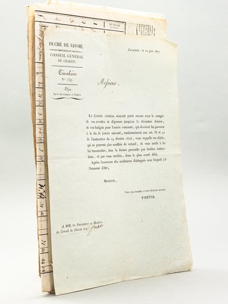1 brochure in-8 d'une page imprimée : Circulaire 756 du 19 mai 1826 - 1 brochure in-8 d'une page imprimée : Circulaire 1347 du 20 juin 1827 - 2 feuillets in-folio pré-imprimés et complétés à la main : Compte Rendu pré-imprimé, complété par M. Magnin André, Receveur Procureur des Recettes et Dépenses de l'Administration des pauvres de la Commune de Pontet depuis le 30 septembre 1826 au 30 décembre 1928 - 2 feuillets in-folio pré-imprimés et complétés à la main : Compte Rendu pré-imprimé, complété par M. Magnin André, Receveur Procureur des Recettes et Dépenses de l'Administration des pauvres de la Commune de Pontet depuis le 30 novembre 1828 au 30 novembre 1830 Les copies conformes révèlent que les recettes sont dues en vertu du Testament de Joseph Picolet Curé du Pontet, du 5 mars 1729, Descollay Notaire, renouvelé par les 17 débiteurs. Intéressant petit lot intéressant la petite commune du Pontet, en Haute-Savoie.