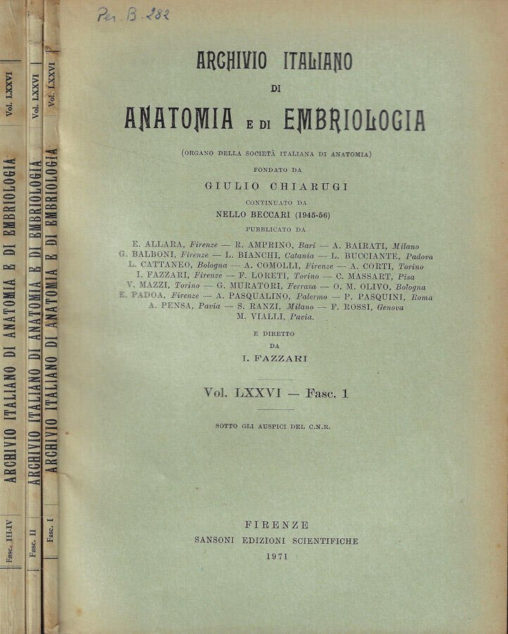 Opera completa in tre volumi, rispettivamente fasc. 1. fasc. 2 e fasc. 3-4, dell'Archivio Italiano di Anatomia e di Embriologia fondato da Giulio Chiarugi e diretto da I. Fazzari. Brossura in cartoncino, scurita in particolare al dorso, con lievi segni d'uso e traccia di inchiostro nero in copertina. Pagine ingiallite, con leggere gore ai tagli, salde, con ampio margine e corredate da numerose figure nel testo. Numero pagine 322 con numerazione consecutiva.