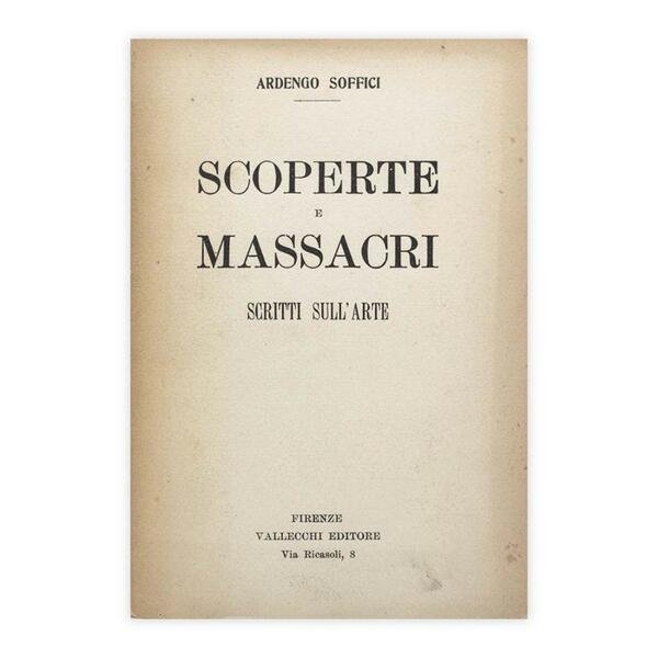 Autore: Ardengo Soffici Titolo: Scoperte e Massacri Sottotitolo: Scritti sull'arte Edizione: Vallecchi Editore - Firenze 1919 Dimensioni: 14 x 20 cm c.a. Pagine: 326 Copertina: Brossura Condizioni: Buone come da foto