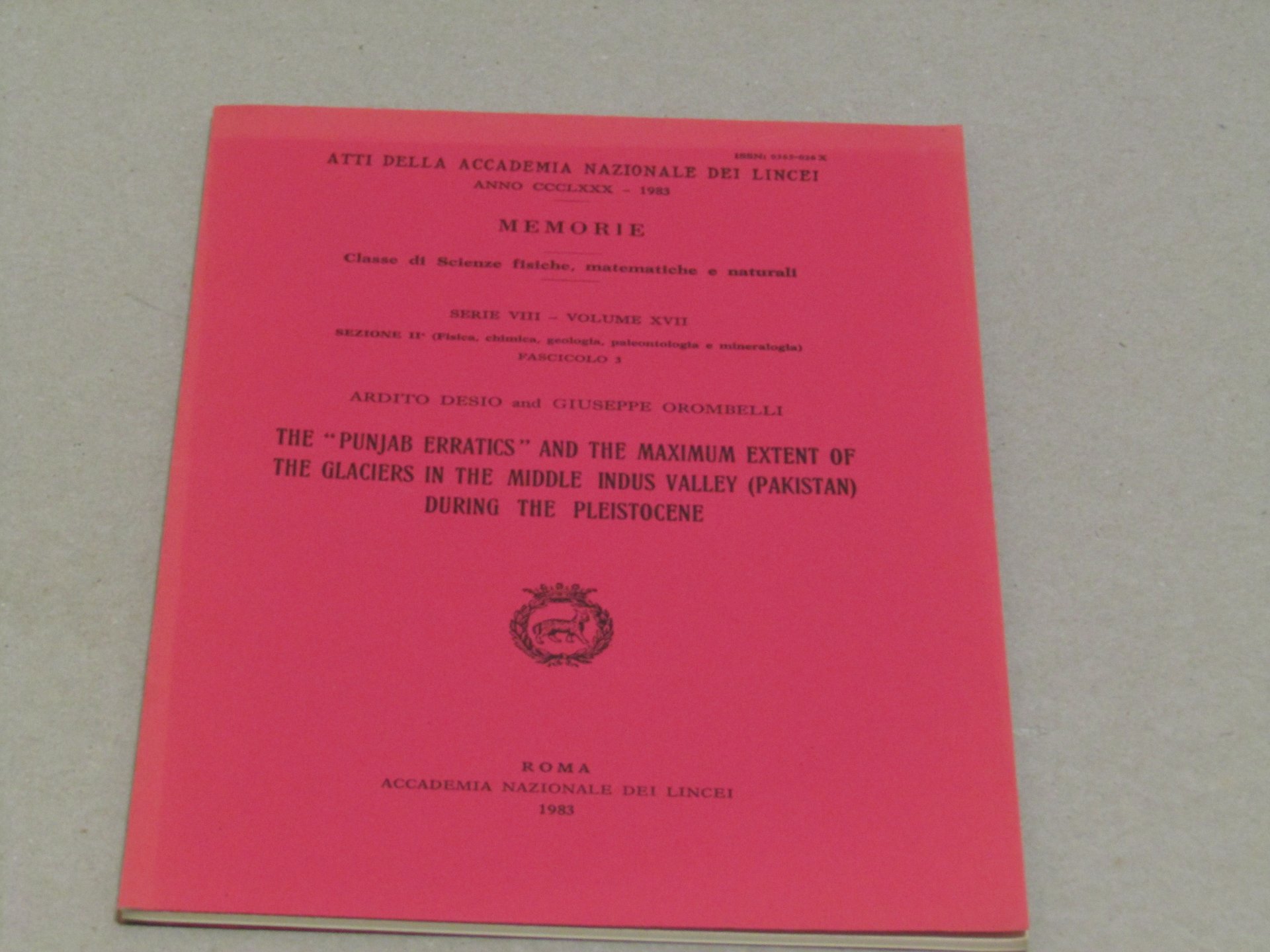 Ardito Desio e Giuseppe Orombelli Ardito Desio e Giuseppe Orombelli. The "punjab erratics" and the maximum extent of the glaciers in the middle Indus valley (Pakistan) during the Pleistocene. Roma, Accademia Nazionale dei Lincei 1983 - I english, in ottavo pp. non numerate Estratto dagli Atti dell'Accademia Nazionale dei Lincei. Pagine leggermente ingiallite.