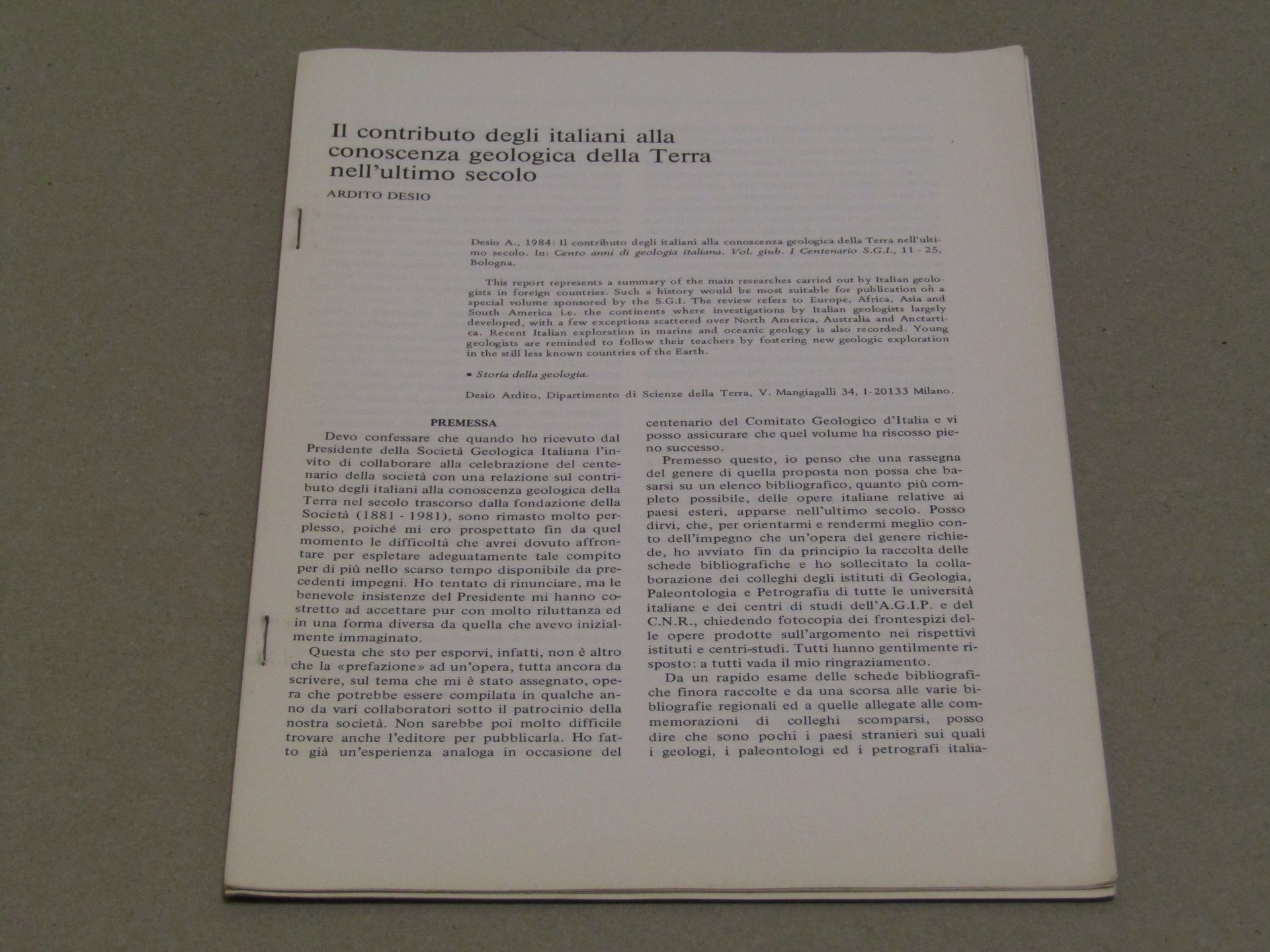 Ardito Desio Ardito Desio. Il contributo degli italiani alla conoscenza geologica della Terra nell'ultimo secolo. Bologna, N. D. 1984 - I italiano, in ottavo pp. non numerate Estratto sul contributo italiano alla ricerca geologica. Pagine leggermente ingiallite. Rilegato a punto metallico.
