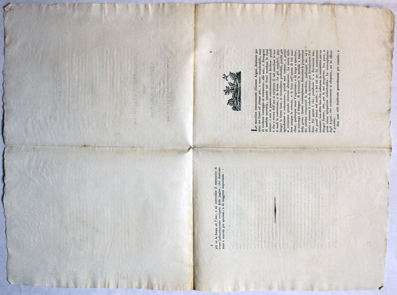 In folio (mm 303x223), pp. 6, (2 bianche) ed 1 tavola fuori testo. Eccezionale esemplare le cui carte risultano ancora unite insieme a formare il foglio intero di stampa. La tavola invece è stampata a parte su un mezzo foglio. Lievi aloni.