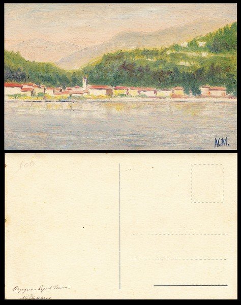 Argegno. Lago di Como. Bella cartolina dipinta ad olio dei primi '900 siglata N. M.