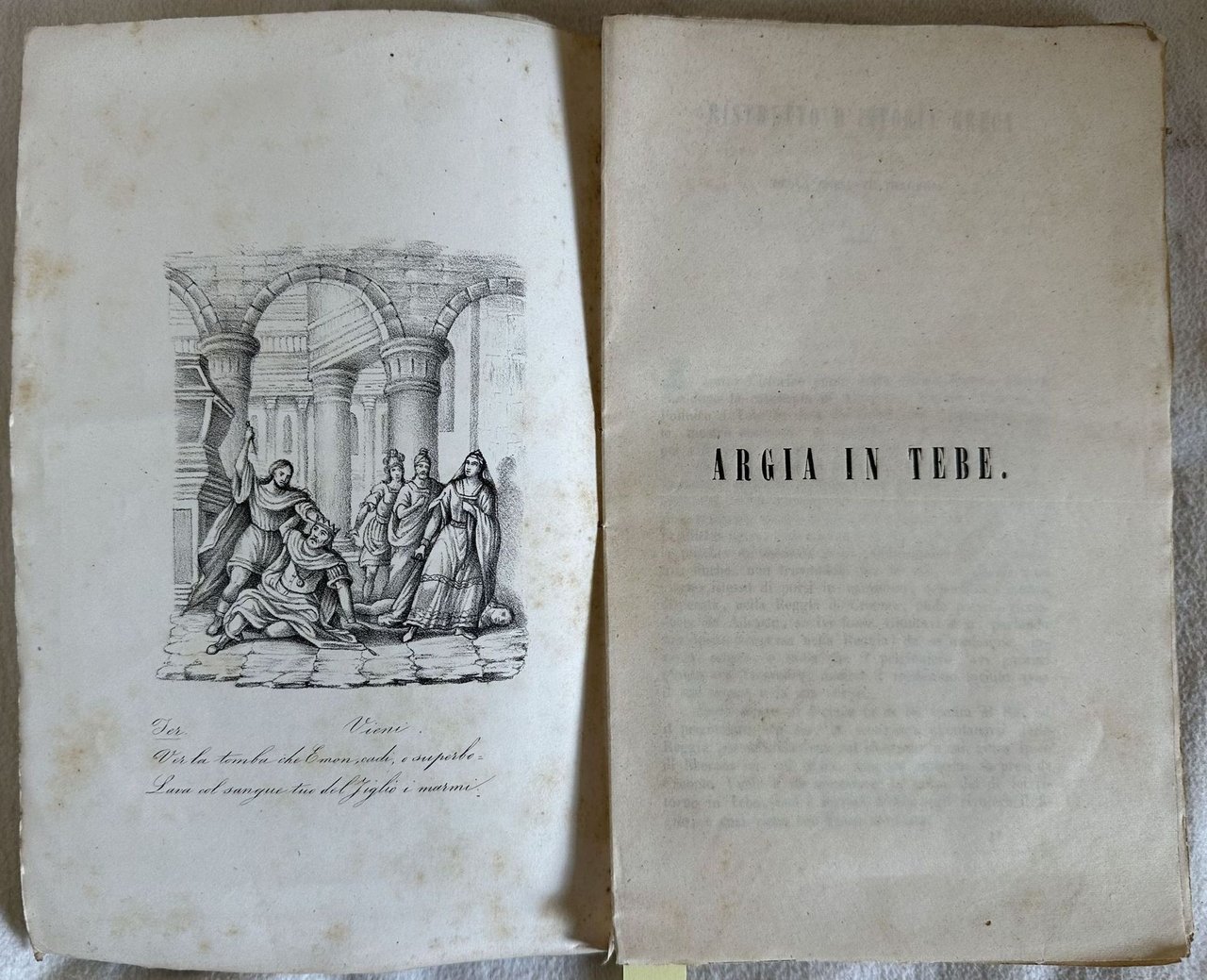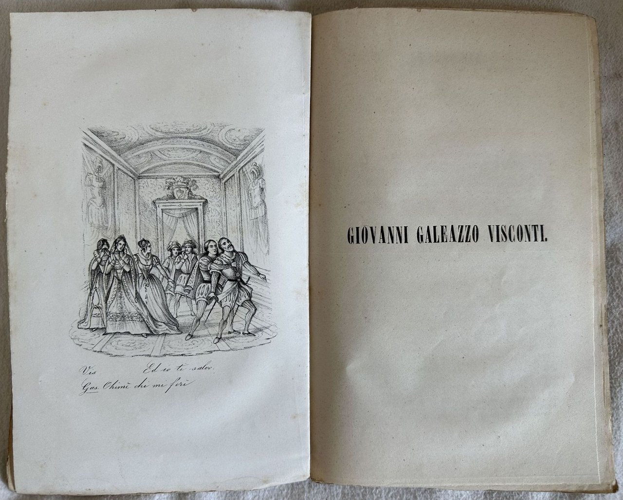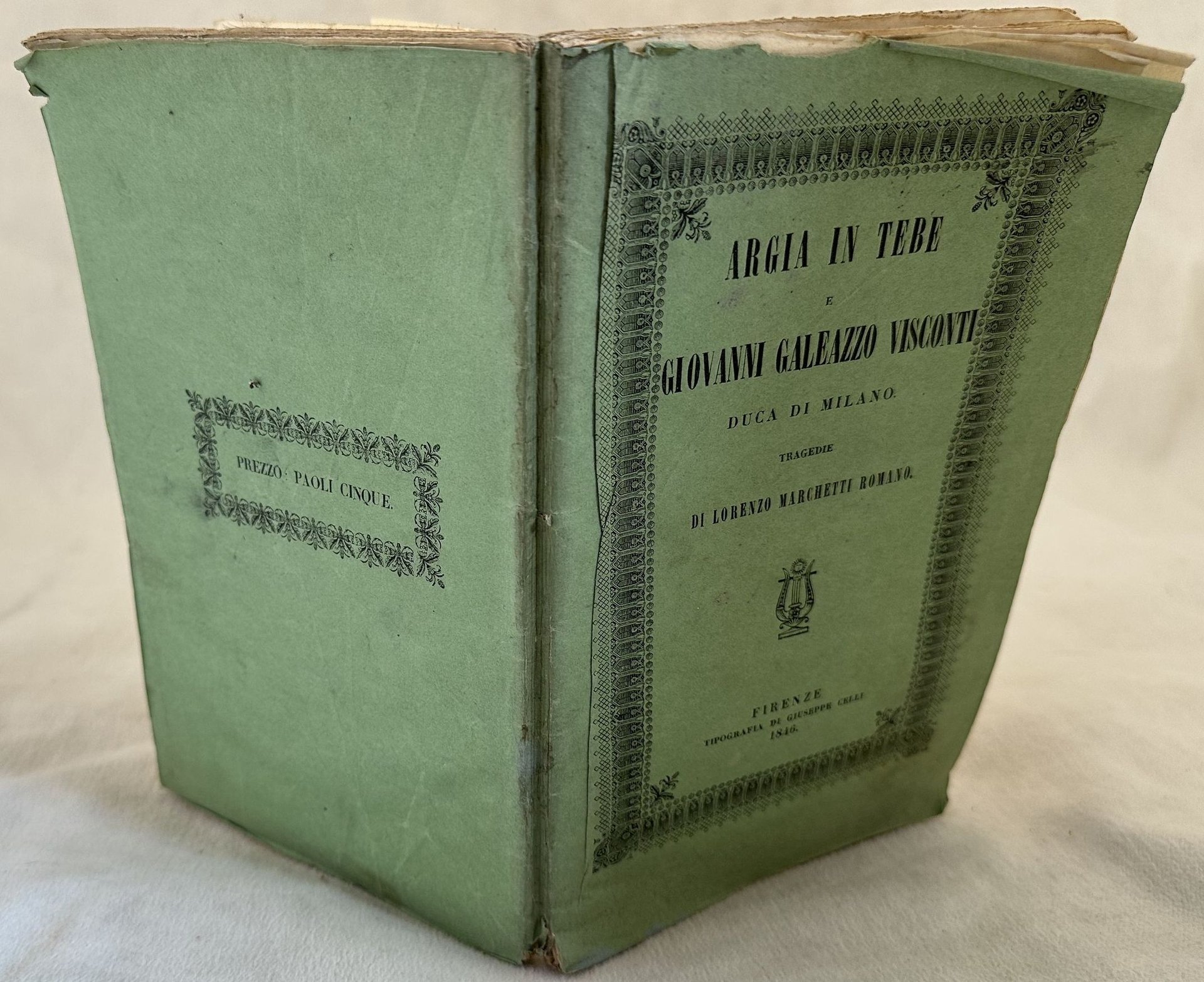 Edizione del 1846 di questa raccolta di due commedie di Lorenzo Marchetti romano (n. 1808). All'interno le due commedie: Argia in Tebe e Giovanni Galeazzo Visconti Duca di Milano. All'interno sono presenti due tavole fuori testo. In buone condizioni. Copertina editoriale in buone condizioni generali con usure e parti mancanti ai margini e dorso. Legatura in buone condizioni. All'interno le pagine si presentano in buone condizioni con fioriture. In 8. Dim. 22x13,5 cm. Pp. 113.Edition of 1846 of this collection of two plays by Lorenzo Marchetti from Rome (n. 1808). Inside the two plays: Argia in Tebe e Giovanni Galeazzo Visconti Duca di Milano. Inside there are two out of text plates. In good conditions. Editorial cover in good general conditions with wearings and missing parts in the edges and spine. Binding in good conditions. Inside pages are in good conditions with foxing. In 8. Dim. 22x13,5 cm. Pp. 113.