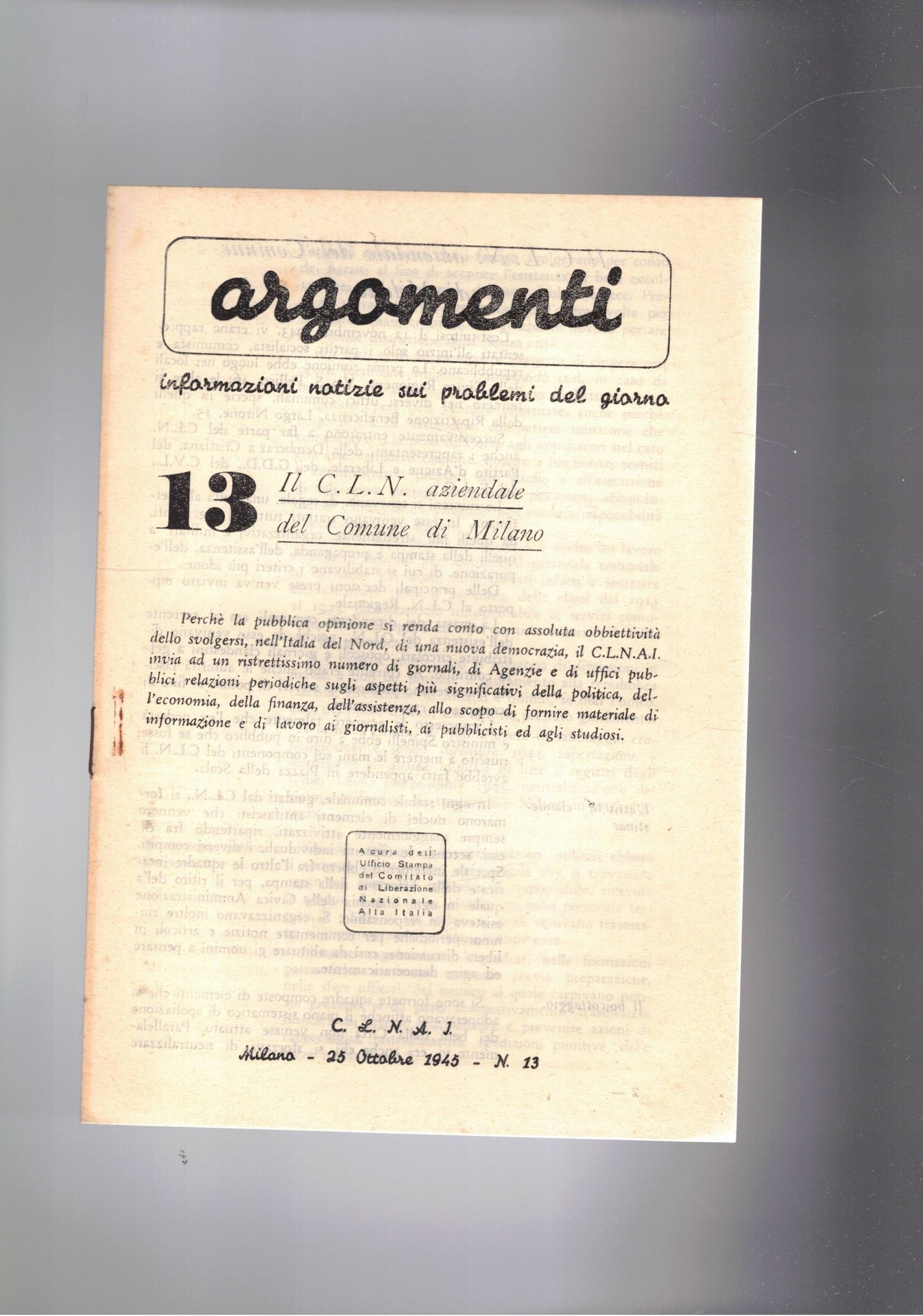 Argomenti, periodico di informazioni, notizie sui problemi del giorno n° 13. Il C. L. N. aziendale del Comune di Milano. A cura del Comitato di Liberazione Nazionale Alta Italia.