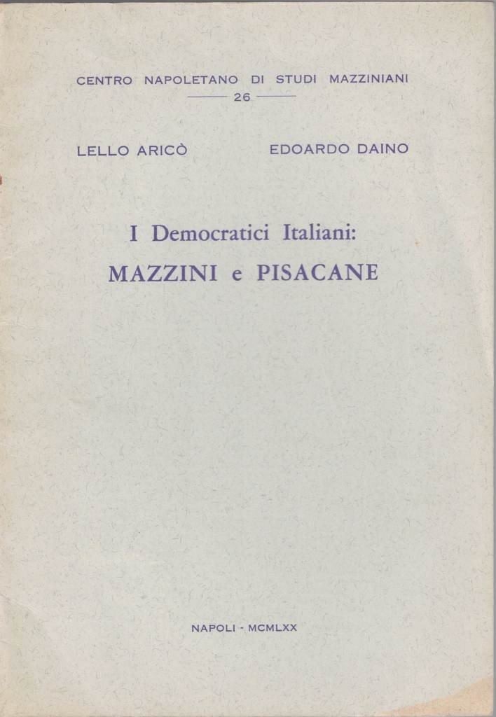 Lello Aricò, Edoardo Daino, I democratici italiani: Mazzini e Pisacane, s.n., Napoli (TipografiaEditrice Glaux) 1970, pp. 25, rilegatura a punto metallico. In testa al frontespizio: Centro Napoletano di Studi Mazziniani. Collana di studi del Centro, vol. 26. Ben conservato.