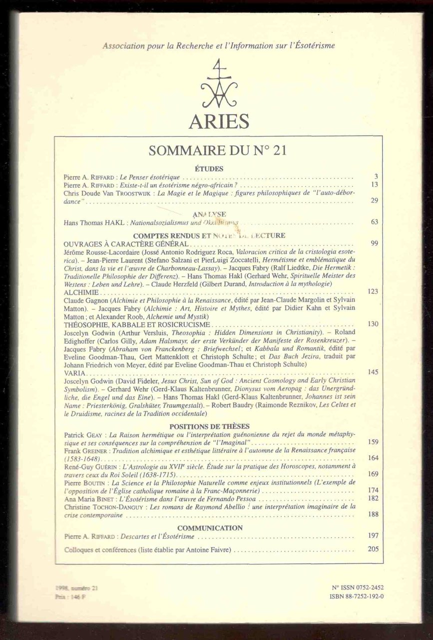 Aries. Association pour la recherche et l'information sur l'ésotérisme. N. 21