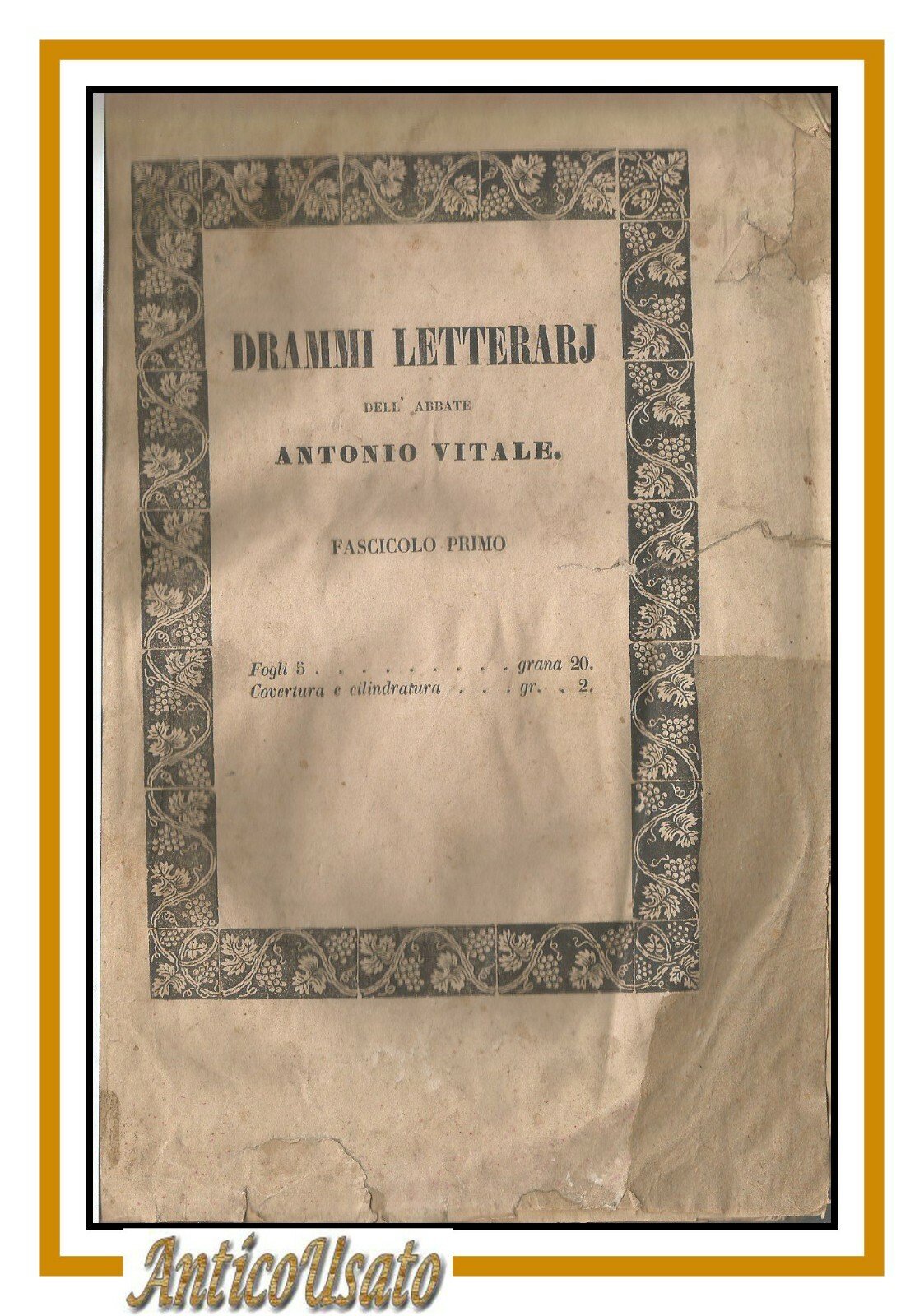 ARIOSTO CAPITATO TRA I BRIGANTI dell'abate Antonio Vitale Napoli, dallo stabilimento poligrafico di C. Cataneo, 1846. volume I dei Drammi Letterari 76 pagine. copertina editoriale in brossura. stato di conservazione buono (pagine ingiallite, fioriture, copertina sciupata)