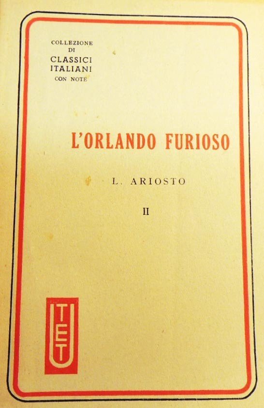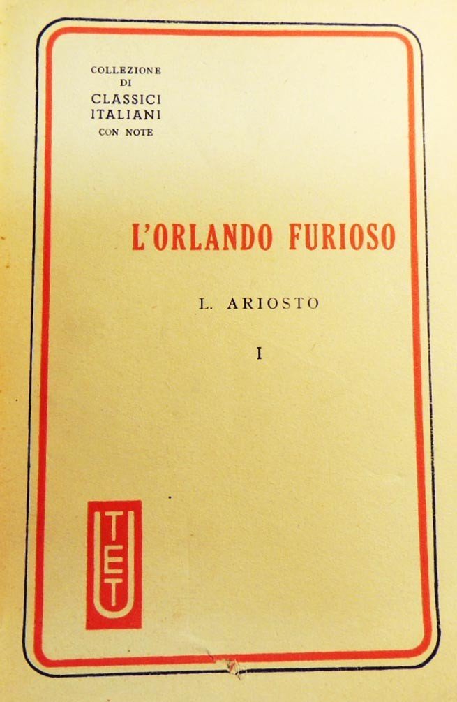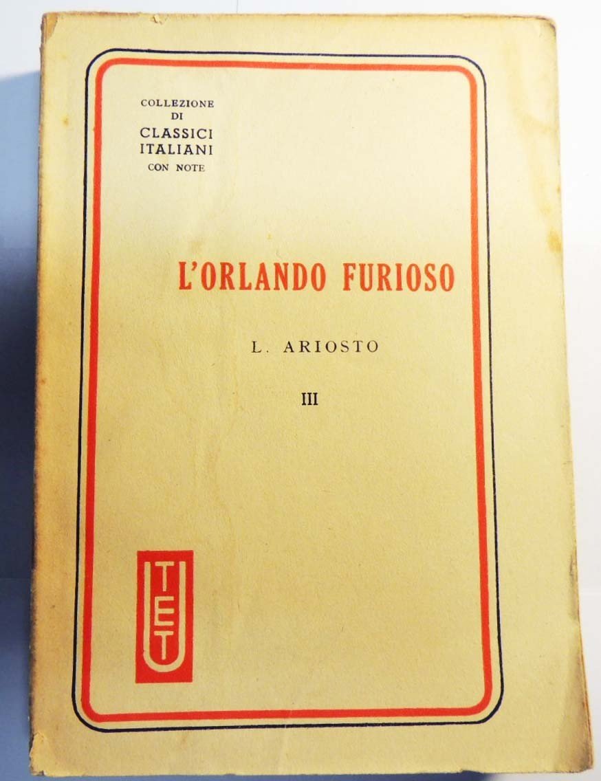 Ludovico Ariosto, L’Orlando furioso, a cura di Filippo Ermini, Unione tipografico-editrice torinese, Torino 1944, 3 voll., pp. 1585, cm 17, br. ed. Collana Collezione di classici italiani con note, n. 29-31. Tracce d’uso alle brossure con strappetti e qualche piccola mancanza, una leggera traccia di gora alla copertina del terzo volume, per il resto esemplari ancora ben conservati.