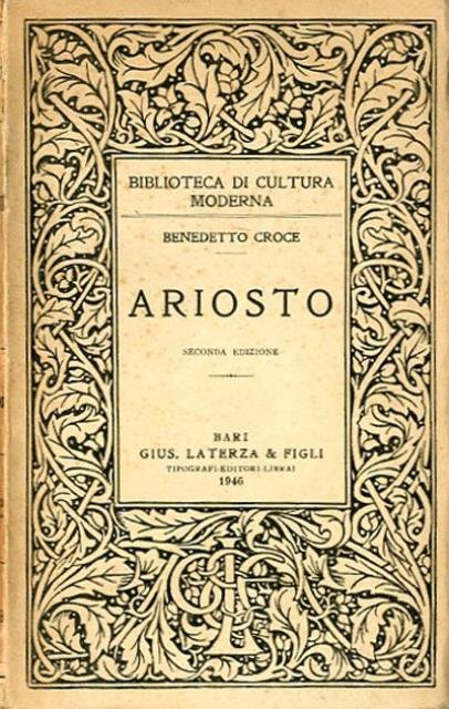 2. ed. 102 p. ; 20 x 13 cm. Biblioteca di cultura moderna, 136. Ariosto, si è detto per secoli, è poeta incantevole, seducente, invincibile. Ma perché i suoi versi agiscono in questo modo? Qual è il loro segreto? Perché continuano a incantarci? Croce si pose tali interrogativi e riuscì a rispondervi con questo saggio, che rimane fra le sue opere in assoluto più felici e quasi come dimostrazione in atto di che cosa possa voler dire la sua celebre distinzione fra poesia e non poesia. In Ariosto, Croce isola «l’armonia» come centro occulto dell’Orlando furioso, ma soprattutto ci fa vedere, attraverso molteplici esempi, che cosa di fatto sia, come si articoli, come si difenda questa armonia. Rare volte la teoria e la pratica di un filosofo della letteratura hanno coinciso così perfettamente come in questo testo. Brossura editoriale, coperta in cartoncino flessibile con titolo impresso al dorso e al piatto riquadrato in cornice con motivi floreali. Qualche leggero segno del tempo (ingiallimento della carta), per il resto esemplare in buono stato. Codice libreria 4827.