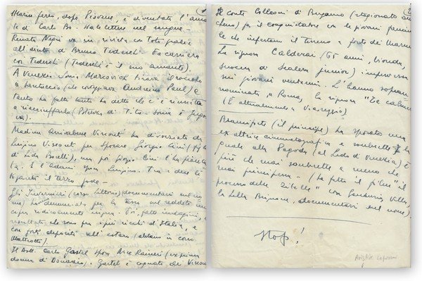 curiosa lettera di 3 pp. manoscritte da Aristide Leporani di pettegolezzi; si trovano vari pettegolezzi su importanti figure dell'epoca come Renata Negri, Maria Ferro, Carolina Maggioni, Conte Colleoni di Bergamo; si tratta di vero e proprio Gossip; buon es.