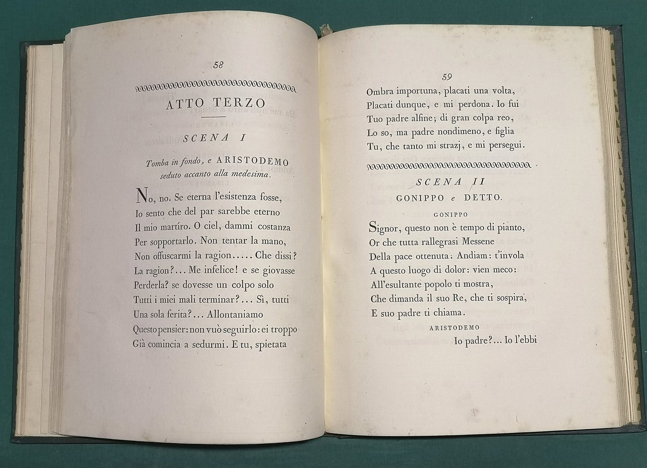 >in-8, pp. (12), 118, (2), bianco l'ultimo f., leg. in tela, titolo in oro al dorso. Vignetta silogr. al front. Terza edizione del dramma di V. Monti composto tra 1784 e 1786 (ulteriori notizie in scheda precedente). Bella e pregevole ediz. di Bodoni. Buon esemplare. Brooks, 332. Bustico, 88. Renda-Operti, pp. 768-775.