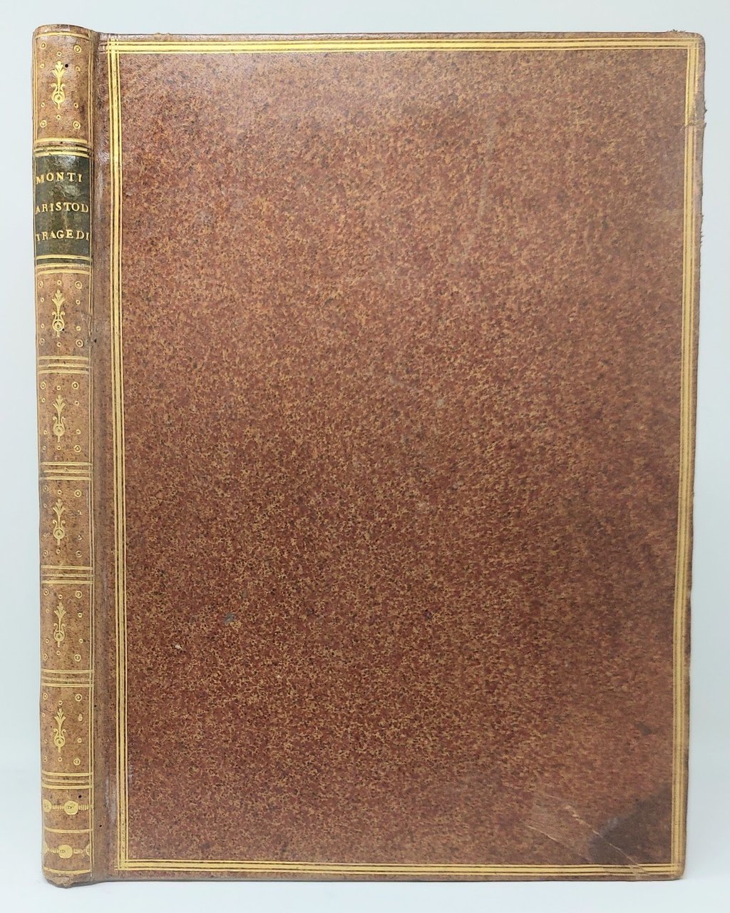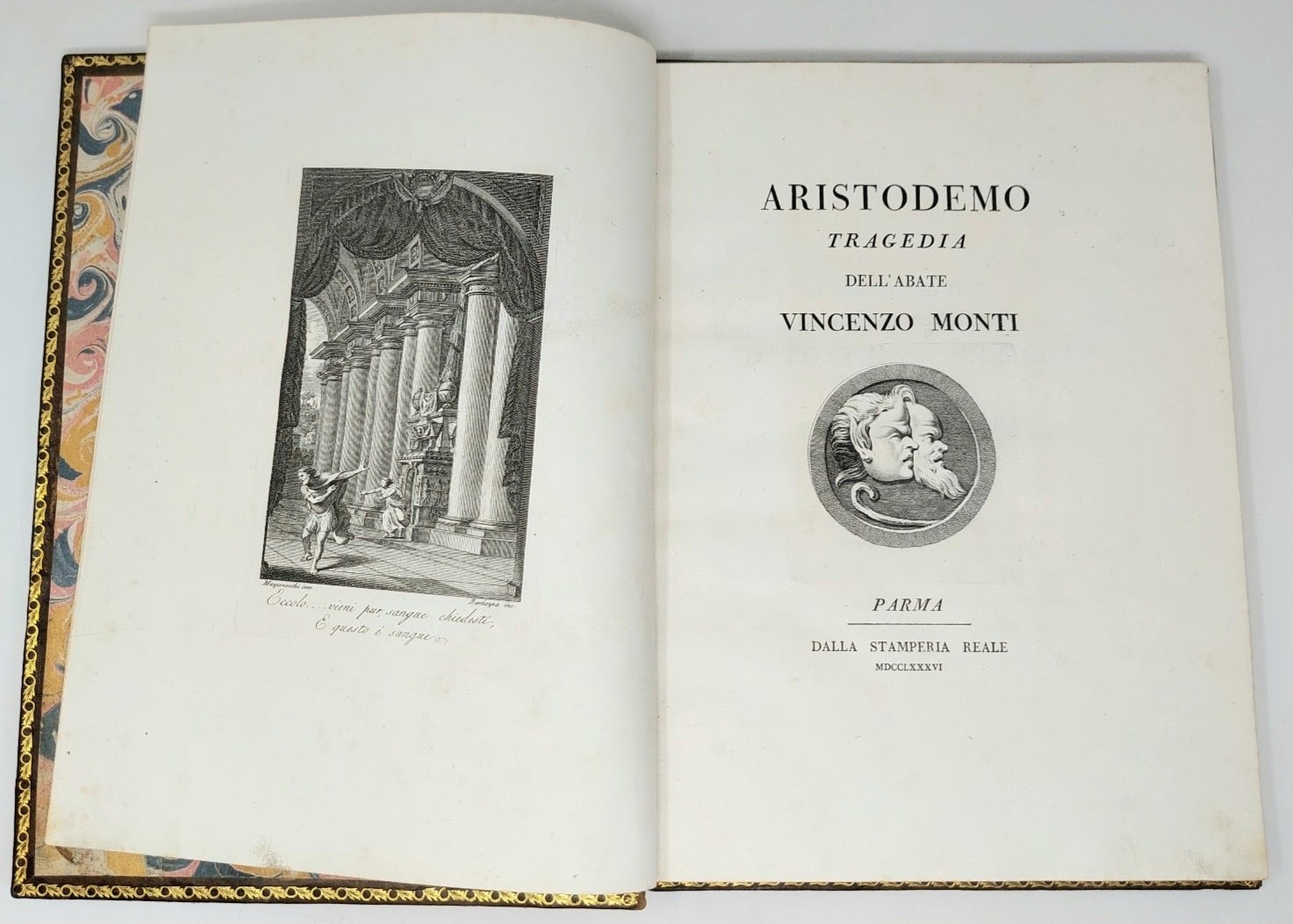 >in-4 (294x220 mm), ff. 6 nn: (compreso antiporta), pp.130, bellissima legatura del tempo in piena pelle marmorizzata, triplice filettatura in oro sui piatti, dorso liscio con fregi oro, titolo su tassello. Antiporta fig. con scena teatrale dis. da Mazzoneschi e inc.da Barbazza; medaglione con due maschere inc. al front. Precede la dedica alla principessa Costanza Braschi Onesti Falconieri, nipote di Pio VI. Edizione originale del primo lavoro teatrale del Monti (1754-1828), magistralmente impresso da Bodoni, il quale si adoperò anche a far rappresentare la tragedia al cospetto del Duca Ferdinando, che premiò l'autore con una medaglia d'oro. La narrazione, che prende spunto da Pausania, risente notevolmente anche degli influssi shakesperiani. Il Goethe, presente alla prima recita privata dell'opera nel 1786, giudicò molto favorevolmente il lavoro. Ottimo esempl., probabilmente uno dei 12 in carta d'Annonay, ex-libris "Del Conte della Trinità" al contropiatto anteriore. Gamba, 2617 ''Splendida edizione''. De Lama, II, 40. Brooks, 312. Parenti, 353. Bustico, 86. Cat. Mostra 1990. n.53.