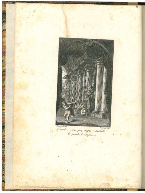 In 4to grande su carta real fina detta di Napoli (303x220mm.). Antiporta calcografica del Bernazza su disegno di Mazzoneschi, 5 ccnn., 130 pp., 1 carta bianca. Al frontespizio calcografia di due maschere tragiche. Segue la dedica a Sua Eccellenza Costanza Braschi Onesti nata Falconieri, nipote di Pio VI. Prime cc. lievemente ed uniformemente brunite, alone marginale alle pp. 87-88. Strappo restaurato al margine superiore dell'antiporta che tocca leggermente l'incisione. Mezza pergamena posteriore, al dorso tassello in pelle con titolo e fregi decorativi incisi in oro (piatti in carta marmorizzata).