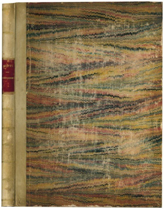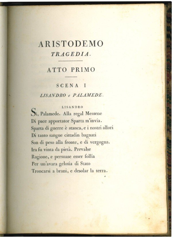 Edizione originale del primo lavoro teatrale del Monti, magistralmente impresso da Bodoni, il quale si adoperò anche a far rappresentare la tragedia al cospetto del Duca Ferdinando, che premiò l'autore con una medaglia d'oro. La narrazione, che prende spunto da Pausania, risente notevolmente anche degli influssi shakespeariani. Il Goethe, presente alla prima recita privata dell'opera nel 1786, giudicò molto favorevolmente il lavoro.