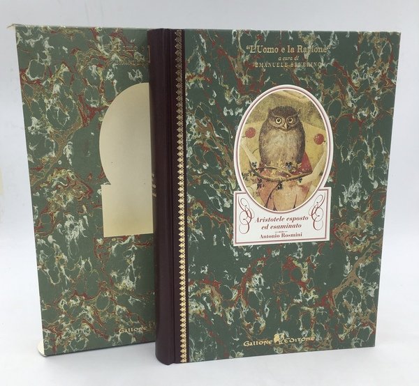 In-8° (cm. 24,5x16,8), pp. LXIV-247 con 1 tavola a col. (attentissima civetta da Bosch). Mz. pelle (similpelle?) tit. e fregi oro, piatti, sguardie e cofanetto in "carte francesi tirate a mano da Enrico Beretta", a marmorizzazione policroma. Nastrino segnalibro. Taglio sup. oro. Cofanetto fustellato a rivelare l'ill. a col. del piatto appl. al piatto ant. ROSMINI contrappone il "realismo aristotelico" a Platone che distingue ideale e reale; e traccia un quadro delle correnti filosofiche sviluppatesi poi sulla scia aristotelica. Es. come nuovo. Costava Lit. 130.000. Edizione esclusiva limitata in 800 copie, il nostro è il. n. 225.