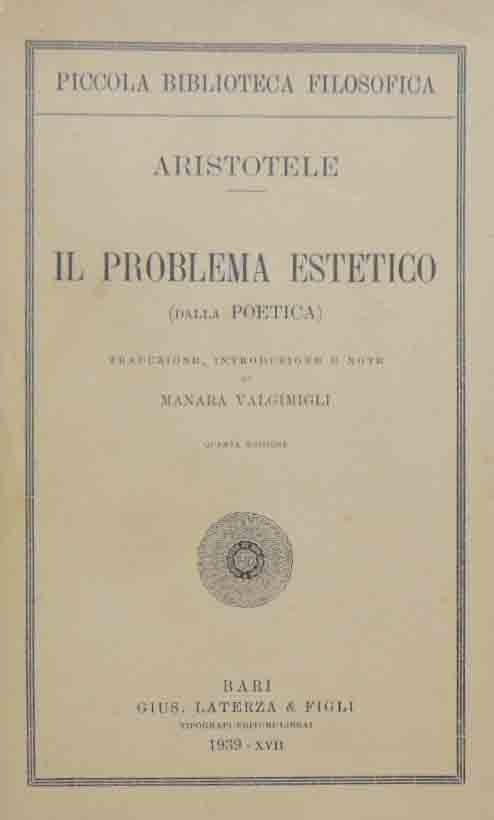 Aristotele, Il problema estetico (dalla Poetica), traduzione, introduzione e note di Manara Valgimigli, Gius. Laterza e Figli Tipografi-editori-librai, Bari 1939, quarta ed., pp. 133, cm 21, br. ed. Collana Piccola Biblioteca Filosofica. Minime tracce d’uso alla brossura, tre carte con qualche sottolineatura a pastello, lapis ed evidenziatore, minime fioriture, carta uniformemente brunita, per il resto buona copia.