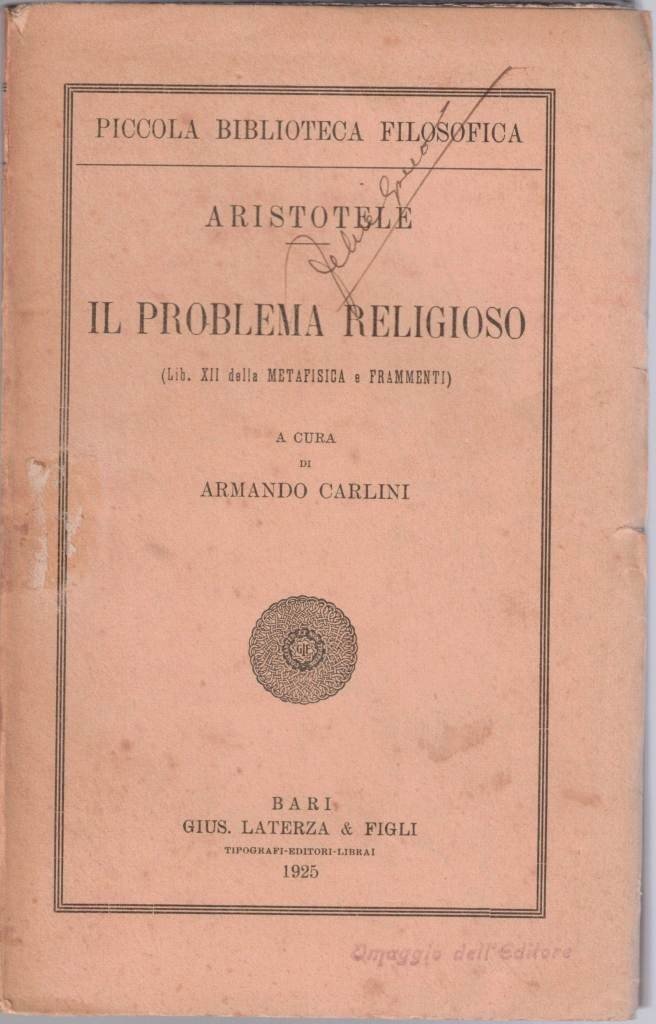 Aristotele, Il problema religioso. Lib. XII della Metafisica e Frammenti, a cura di Armando Carlini, Gius. Laterza e Figli Tipografi-Editori-Librai, Bari 1925, pp. 92, cm 20, br. ed. Collana Piccola biblioteca filosofica. A prima di copertina e occhiello, firma d’apartenenza e timbro Omaggio dell’Editore. Lievi tracce d’uso alla brossura con minimi residui di etichetta rimossa al dorso, sporadiche fioriture, tenue brunitura della carta, per il resto ben conservato. In gran parte intonso.