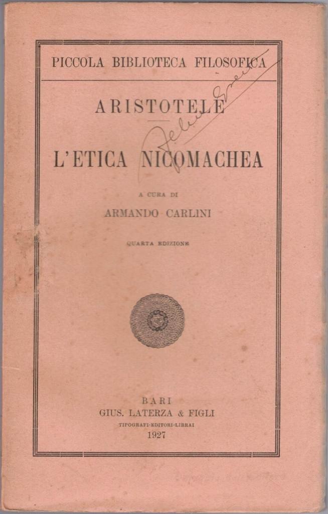 Aristotele, L’etica Nicomachea, a cura Armando Carlini, Gius. Laterza e Figli Tipografi-Editori- Librai, Bari 1927, quarta ed., pp. 148, cm 20, br. ed. Collana Piccola biblioteca filosofica. All’occhiello, timbro: Omaggio dell’Editore. Firma d’appartenenza a prima di copertina e occhiello. Minimi residui di etichetta con prezzo rimossa al dorso, sporadiche fioriture, lieve brunitura della carta, per il resto perfetto. In buona parte intonso.