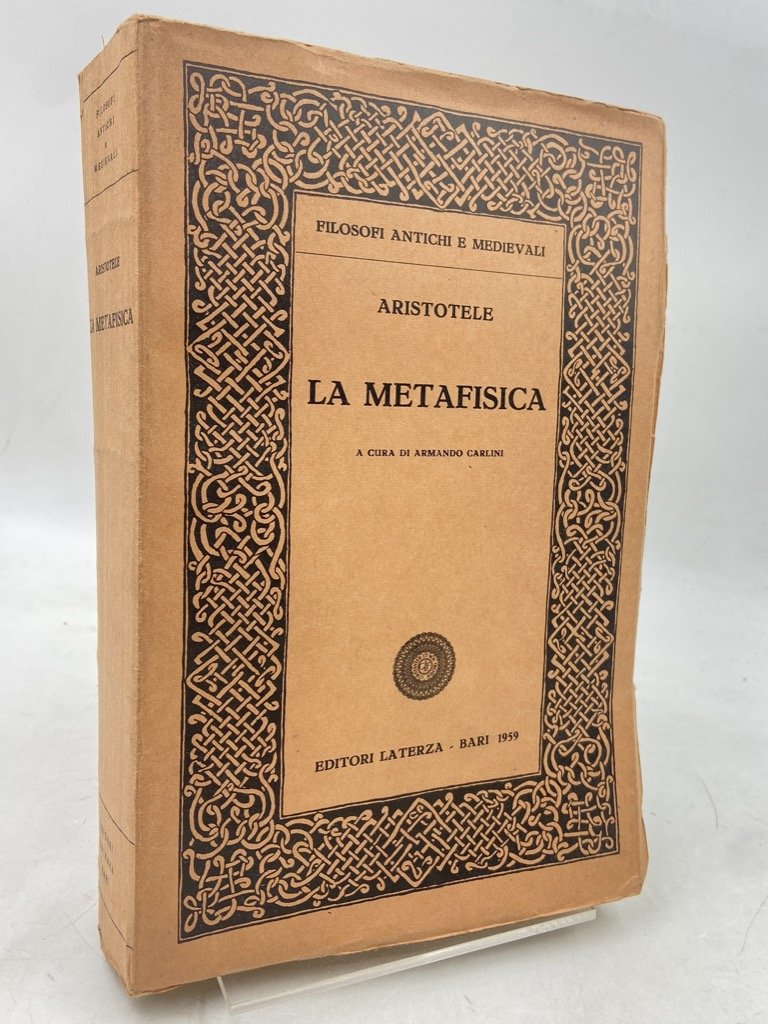 Brossura editoriale, cm 21.5 x 14, pp CXXVI 520 (4). Terza edizione della Metafisica di Aristotele nella traduzione di Armando Carlini, successore di Giovanni Gentile alla cattedra di Filosofia Teoretica a Pisa. La versione del testo fu originariamente pubblicata nel 1928 ed è accompagnata da una nota introduttiva e da un sommario ragionato.