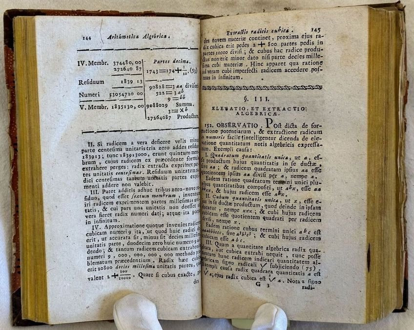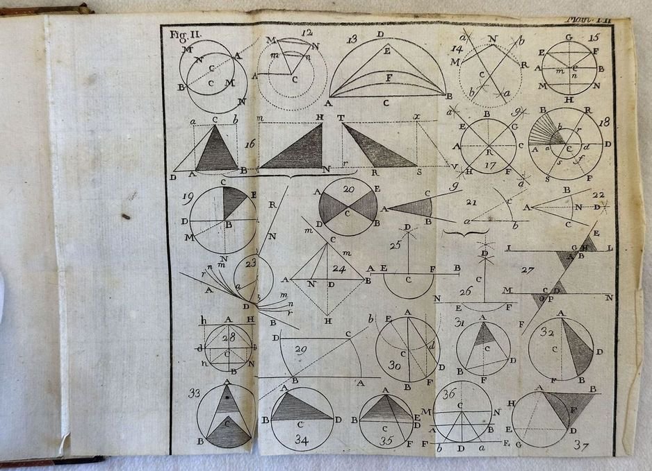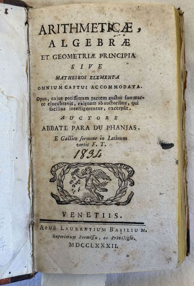 Edizione veneziana del 1782 di questo studio di aritmetica algebra e geometria scritta da F. Para du Phanjas (1724-1979) Professore a MArsiglia Grenoble e Besancon. Traduzione dal francese in latino a cura del gesuita Francisco Tortosa. Antiche note manoscritte datate 1834. Alla fine sono presenti sette tavole ripiegate di figure geometriche e diagrammi. In buone condizioni. Copertina in mezza pelle con titolo manoscritto al dorso in buone condizioni generali con lievi usure ai margini e dorso. Legatura in buone condizioni. Pagine in buone condizioni con rare fioriture. Macchia di inchiostro a pag. 93 con perdita di testo. In 16. Dim. 18x10 cm. Pp. 618+(2)+7 pl. Venetian edition of 1782 of this study of arythmetics algebra and geometry written by F. Para du Phanjas (1724-1979) Teacher in MArsiglia Grenoble and Besancon. Traslation from french to latin by the jesuit Francisco Tortosa. Antique handwritten notes dated 1834. Att he end there are seven folded plates of geometrical figures and diagrams. In good conditions. Half leather cover with handwritten title in the spine in good general conditions lightly worn in the extremities. Binding in good conditions. Inside pages are in good conditions with occasional foxing. Ink stain in pag. 93 with loss of text. In 16. Dim. 18x10 cm. Pp. 618+(2)+7 pl.