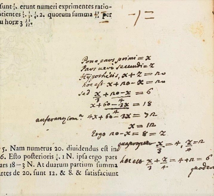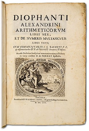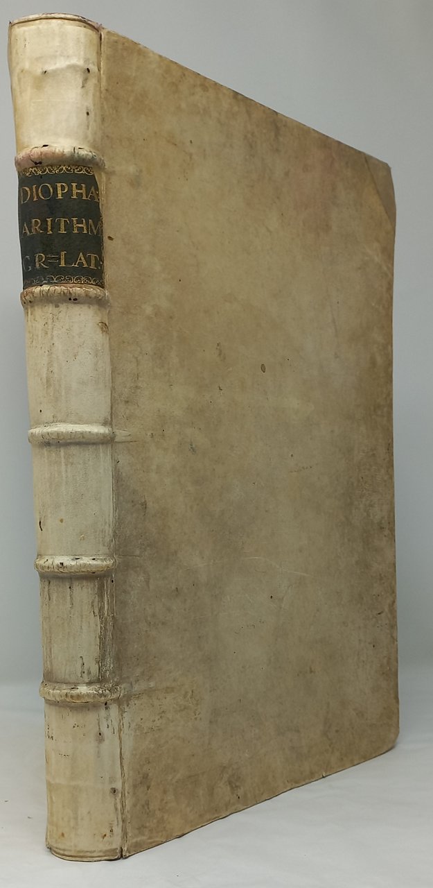 >in-folio (mm 350x230), pp. (12), 64; 341; 48, legatura coeva in piena pergamena, dorso a cinque nervi, titolo in oro su tassello verde. Titolo con grande vignetta incisa in rame firmata da Rabault, con motto; elaborati frontalini e finalini incisi in rame, figure geometriche n.t. Errore di paginazione a pp. 165-166, e 335-336. Buon esemplare su carta forte, restauri al tassello e a una cerniera, piccolo alone al titolo, qualche macchietta ad alcuni fogli, lieve gora d'umido nel margine interno dei primi dieci fogli. Senza l'errata come per la maggior parte degli esemplari conosciuti. Testo greco e latino su colonne parallele, commento latino su un'unica colonna. A cura di Claude Bachet de Méziriac (1581-1638). Prima edizione dei commentari di Pierre de Fermat sull'Aritmetica di Diofanto di Alessandria, nonché, prima enunciazione del teorema sulla teoria dei numeri. Poiché possedeva una copia dell'editio princeps greca del 1621, Fermat scrisse delle note sui problemi matematici posti da Diofanto, ma morì senza alcuna intenzione di pubblicarle. Quando suo figlio Claude-Samuel scelse di includere le annotazioni in questa seconda stampa dell'opera, presentò il primo contributo di un matematico rinascimentale alla teoria dei numeri e il primo passo verso l'invenzione del calcolo differenziale. La più famosa delle 48 osservazioni di Fermat si trova a p. H3r: la prima enunciazione del suo celebre "Ultimo Teorema", che non fu dimostrato fino al 1995, quando Andrew Wiles, professore a Princeton, concluse una dimostrazione di 130 pagine. Fermat sosteneva di conoscere la prova, ma che gli mancasse lo spazio a margine per illustrarla ("Hanc marginis exiguitas non caperet"). Interessante chiosa manoscritta a pag 279 che riporta calcoli matematici. Honeyman 893; Norman 777.DSB, IV, 573. Smith, Rara Arithmetica, p. 348.