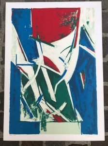 Bella serigrafia dai colori vivaci stampata in 100 esemplari ( nostra n. 74) del pittore Armando Pizzinato. Piccolissima spellatura all'angolo sup. sx , per il resto bel foglio . Mis. 700 x 500