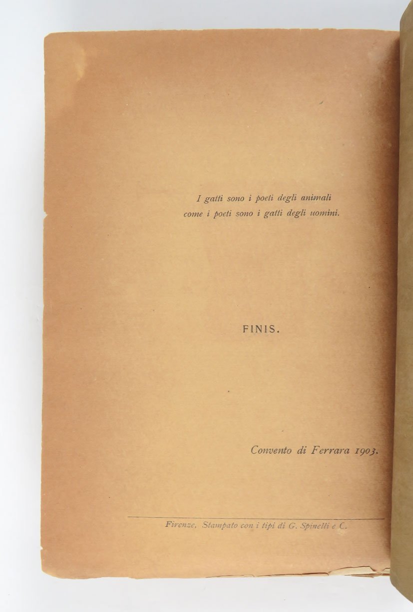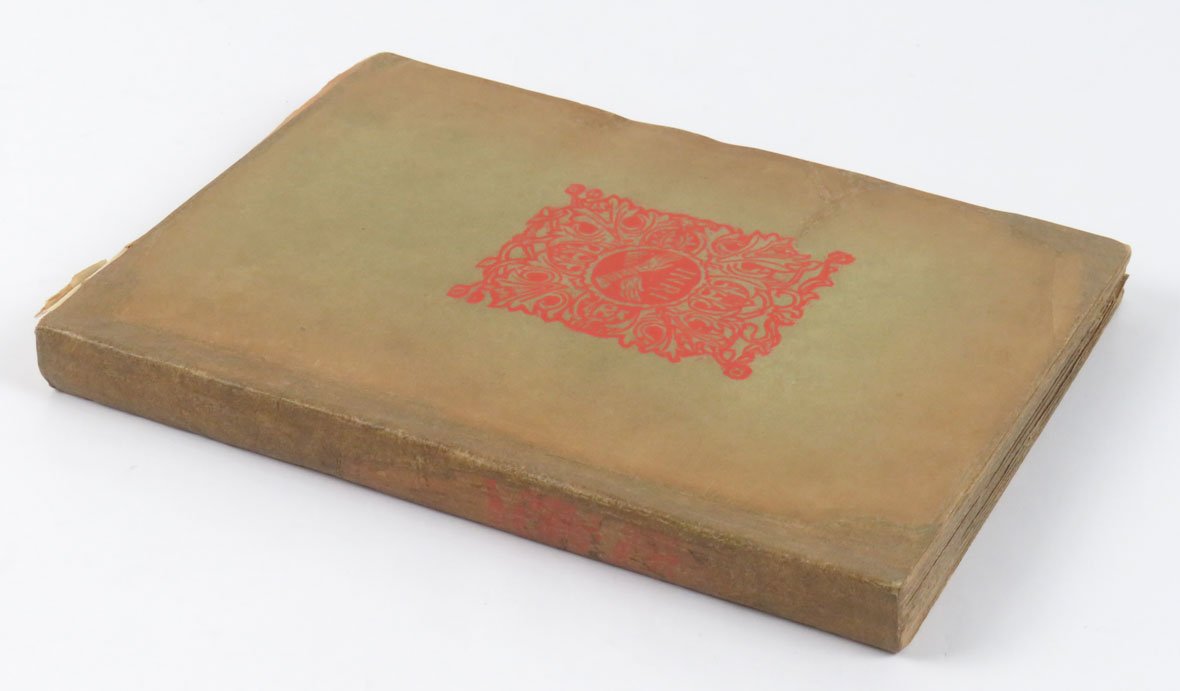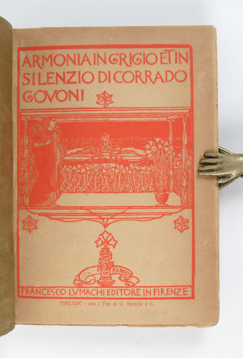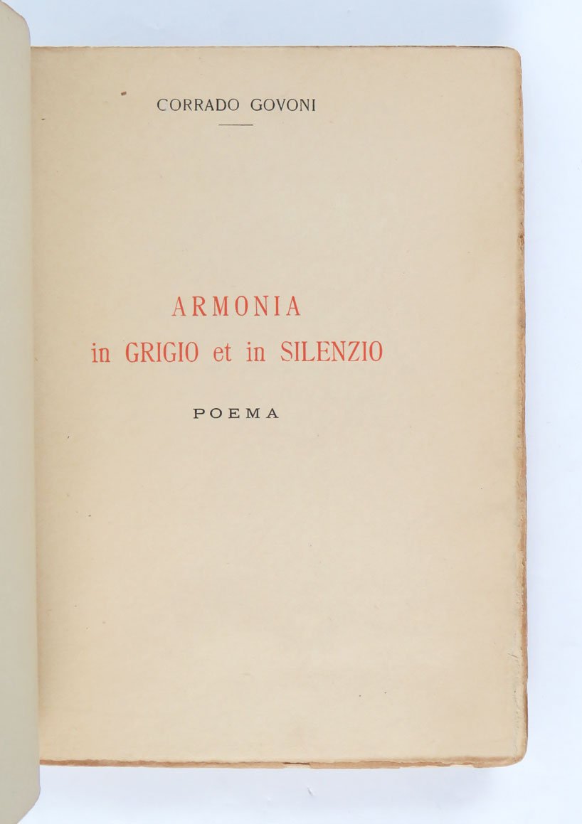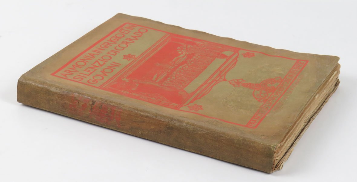 LIBROEdizione originale.Esemplare caratterizzato da vistosi restauri integrativi ai bordi e al dorso della copertina originale in brossura; prima e ultima carta brunite, come usuale; per il resto in più che buone condizioni.Raro secondo libro di Corrado Govoni, segue di pochi mesi l’esordio con «Le Fiale». È probabilmente l’opera del ferrarese più vicina alla poetica e agli stili dei crepuscolari. Tipograficamente, il libro si compone di 206 pagine tirate su una bella carta di alta grammatura in barbe, racchiuse da due carte diverse, tendenti a scurirsi in maniera sensibilmente diversa dal resto del libro, sulle quali sono incise in rosso le xilografie di De Carolis; il tutto rilegato in una brossura in carta verde anch’essa stampata in xilografia dal maestro marchigiano.Cammarota, Futurismo, 249.2